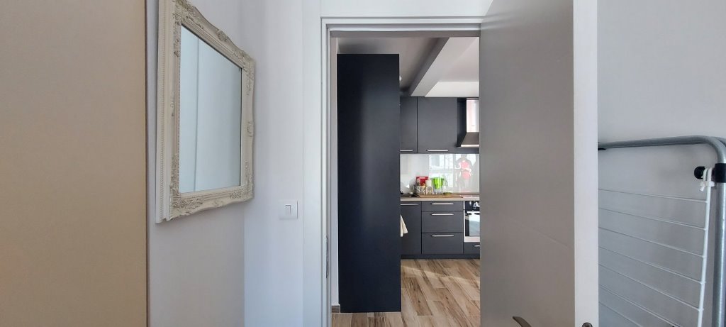 The apartment has the following layout: entrance hall, kitchen combined with living room and dining room, one bedroom, bathroom, small terrace in the living room and a spacious roof terrace.