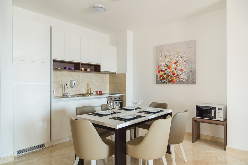 In the third building, one-bedroom apartments with an area between 58 and 85 m2 are for sale. All apartments have underfloor heating and air conditioning in the living room and bedroom. Also, the apartments are fully equipped with the same furniture, the only difference is in the orientation of the apartment, the square footage and the floor on which the particular apartment is located. The building has a reception, a restaurant and a swimming pool.
