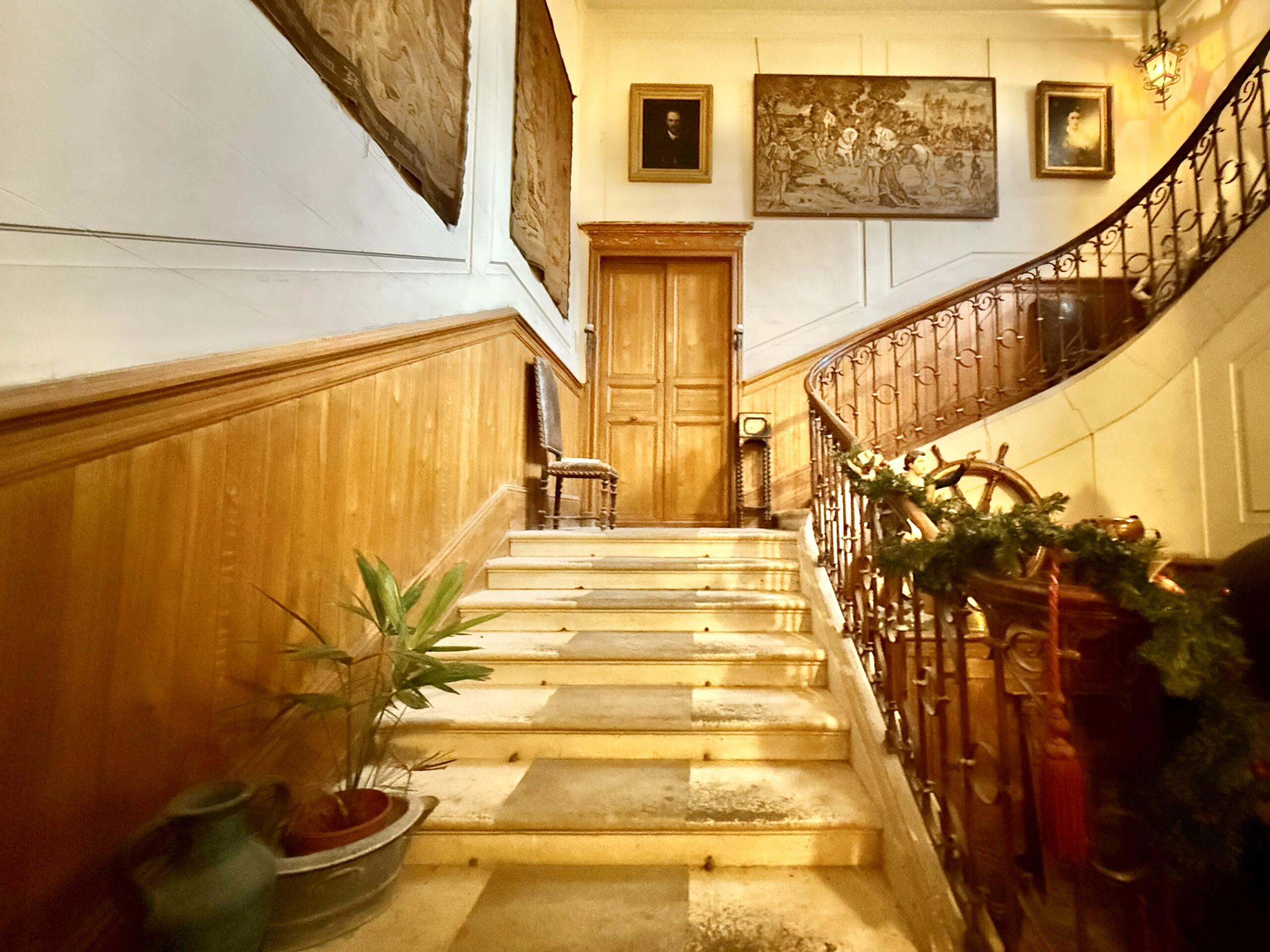 The grand ground floor opens into an impressive entrance hall featuring a stone staircase with wrought-iron balustrade. This level offers a series of elegant reception rooms, including a spacious salon, formal dining room, office, fully equipped kitchen, laundry room, and a bedroom with adjoining bathroom—ideal for guests or single-level living.