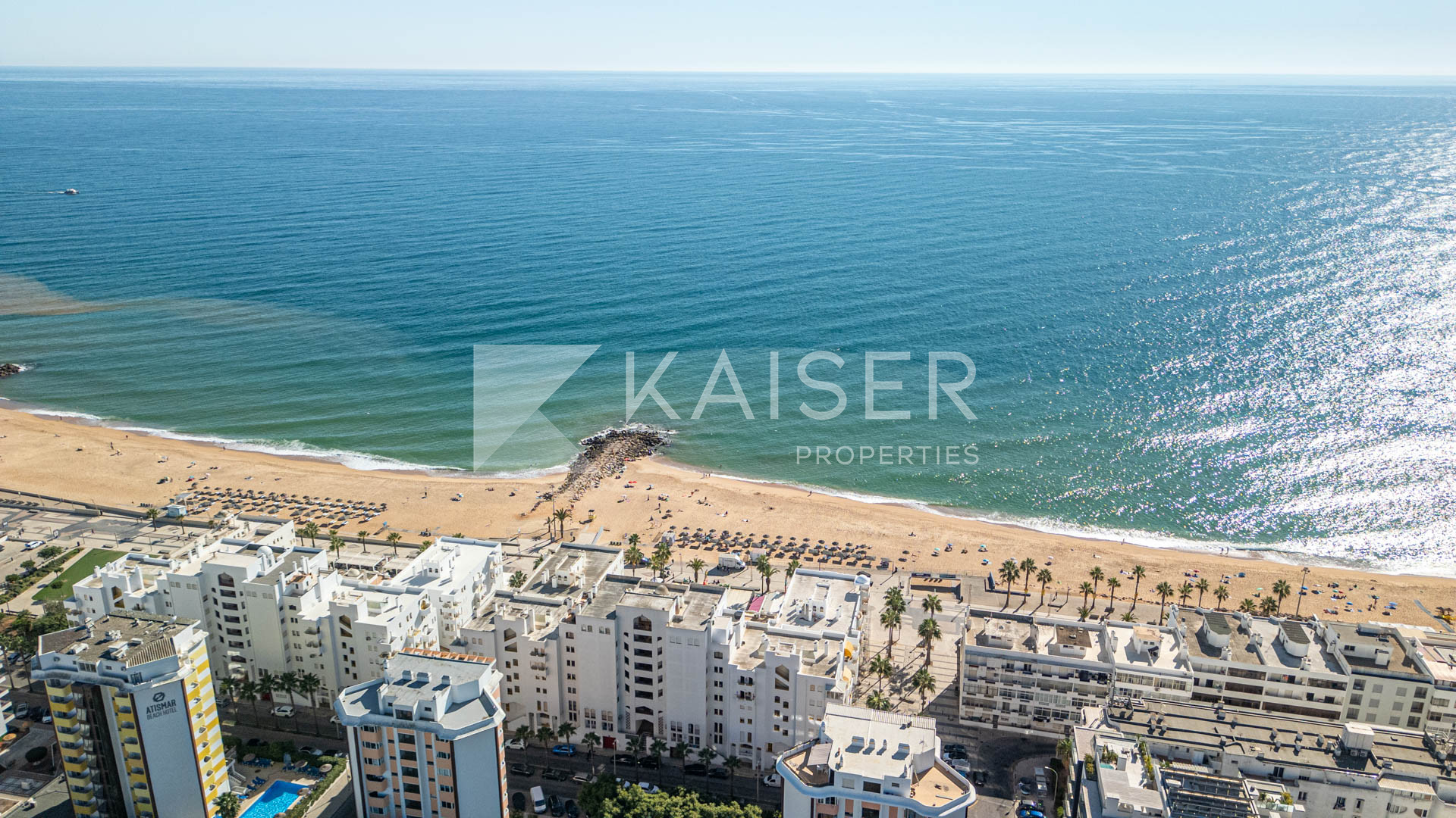 The open-concept living space seamlessly connects the lounge, dining area, and modern, fully equipped kitchen, creating a bright, inviting atmosphere. Large sliding doors open onto a south-facing balcony with privileged, uninterrupted views over Quarteira beach – ideal for enjoying the Algarve sunshine. The apartment features 2 bedrooms, 2 contemporary shower rooms (one en-suite), and a storage room.