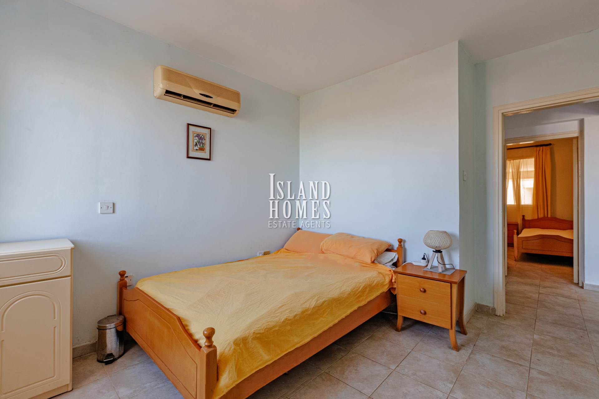This is a fantastic opportunity to purchase a ground floor apartment on a well maintained complex in a quiet but convenient location of Kapparis. The property entrance is accessible from the covered parking area, as soon as you open the door your eye is drawn to the gorgeous sea view in the distance. The apartment has an open plan layout consisting of kitchen, living and dining area. The property, in need of some modernisation, has so much potential for its new owners. Both bedrooms include fitted wardrobes and the bathroom, located between the bedrooms includes a shower, WC and sink as well as a handy built in storage cupboard, ideal for extra towels and toiletries.