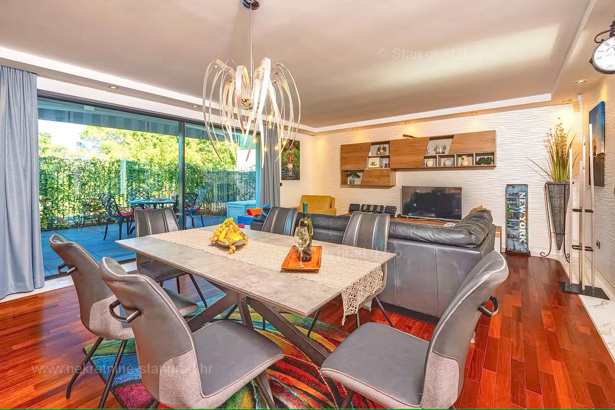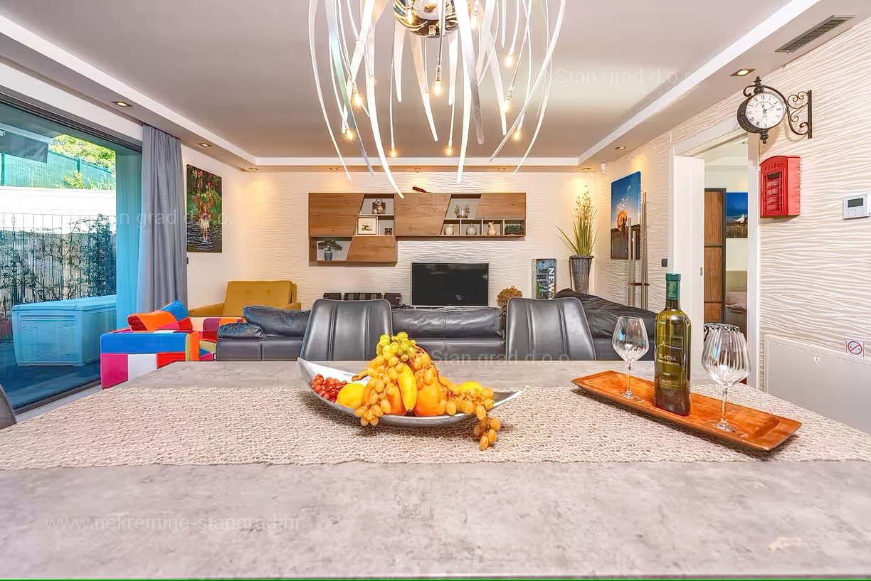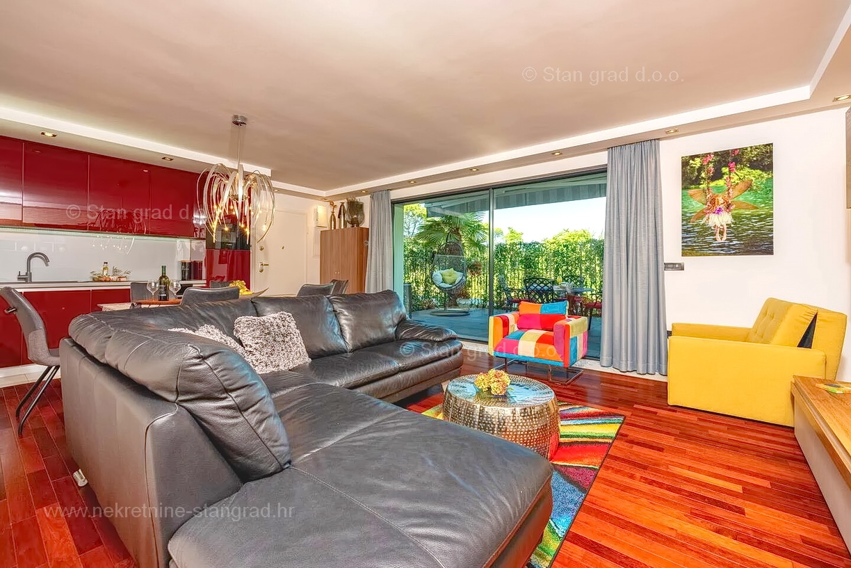 In the real estate offer of the Stan Grad Immobilien agency, on the island of Krk, there is a very attractive apartment perfect for a tourist stay and vacation on the Adriatic. This apartment is located in an excellent and rarely available location very close to the sea and near the center of Malinska and key life amenities. Considering the property type, this is a spacious one-story apartment. Within a beautifully built building, the apartment is located on the ground floor. The area of this apartment is 64 m2 in total. The aforementioned area includes an open space living room and kitchen with dining room, 2 bedrooms, 2 bathrooms, toilet and terrace. A rich set of newer generation appliances has been installed in the exceptionally maintained and luxuriously furnished interior of the property in question. It should also be emphasized that the ownership of this apartment includes a very beautifully decorated and refined garden of approximately 80 m2. The owner of the apartment will have one parking space at his disposal. In addition to the above, it can also be noted that the apartment is oriented in such a way that it offers a beautiful view of the lovely coastal landscape and the immediate surroundings of the settlement. This apartment is owned by a natural person, so the buyer is obliged to pay 3% sales tax when transferring ownership to his name. The owner of the property guarantees the orderliness of the relevant ownership documents and the possibility of a quick transfer of ownership of the apartment to the buyer. Please contact us and we will be happy to welcome you to our office on the island of Krk. In addition to finding and showing the property, the agent Stan Grad Immobilien will assist you in all necessary actions related to the transfer of ownership and taking over the property.
