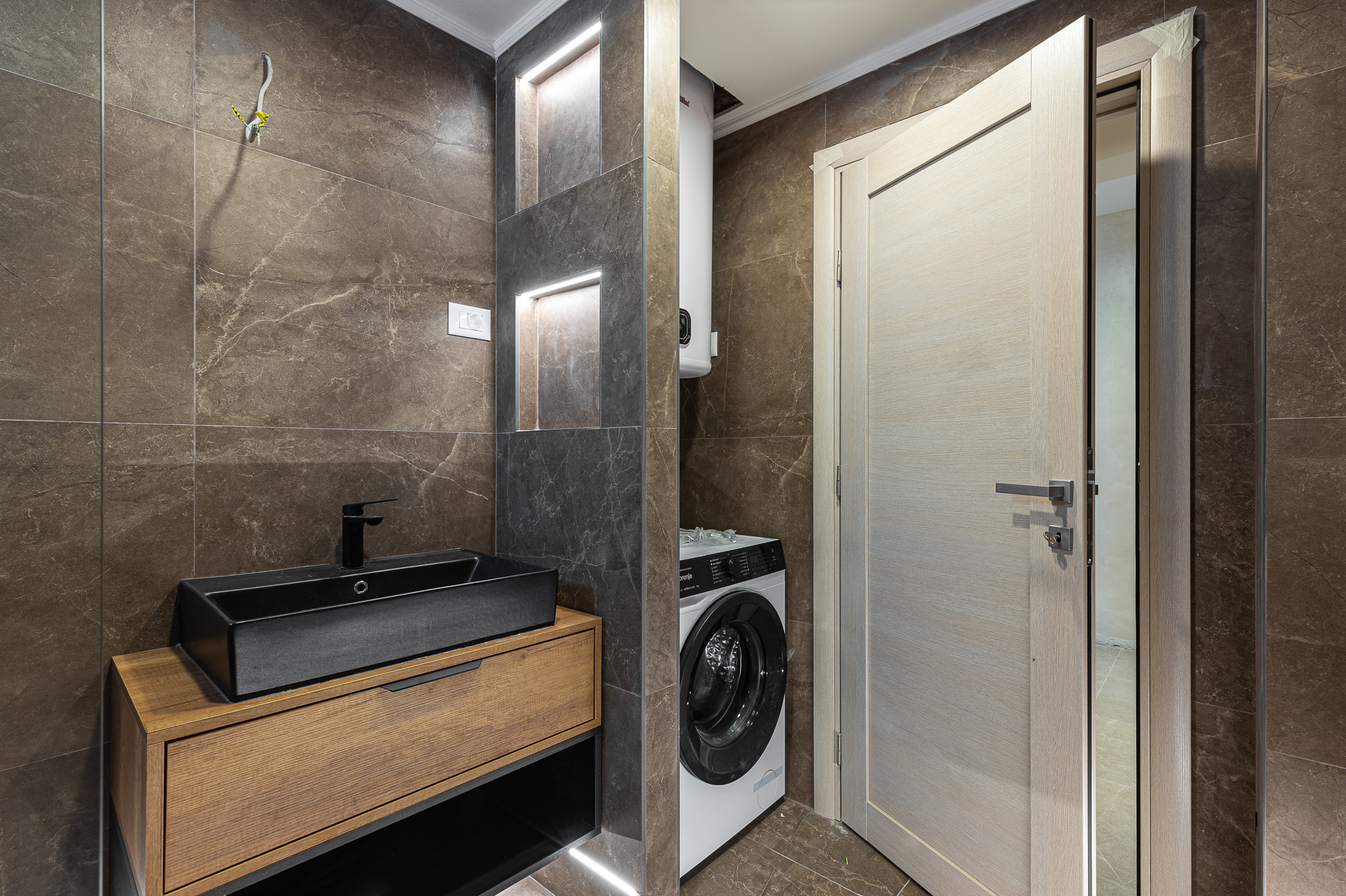 The apartment has been completely finished and renovated, with a new kitchen, bathroom, and air conditioning installed.