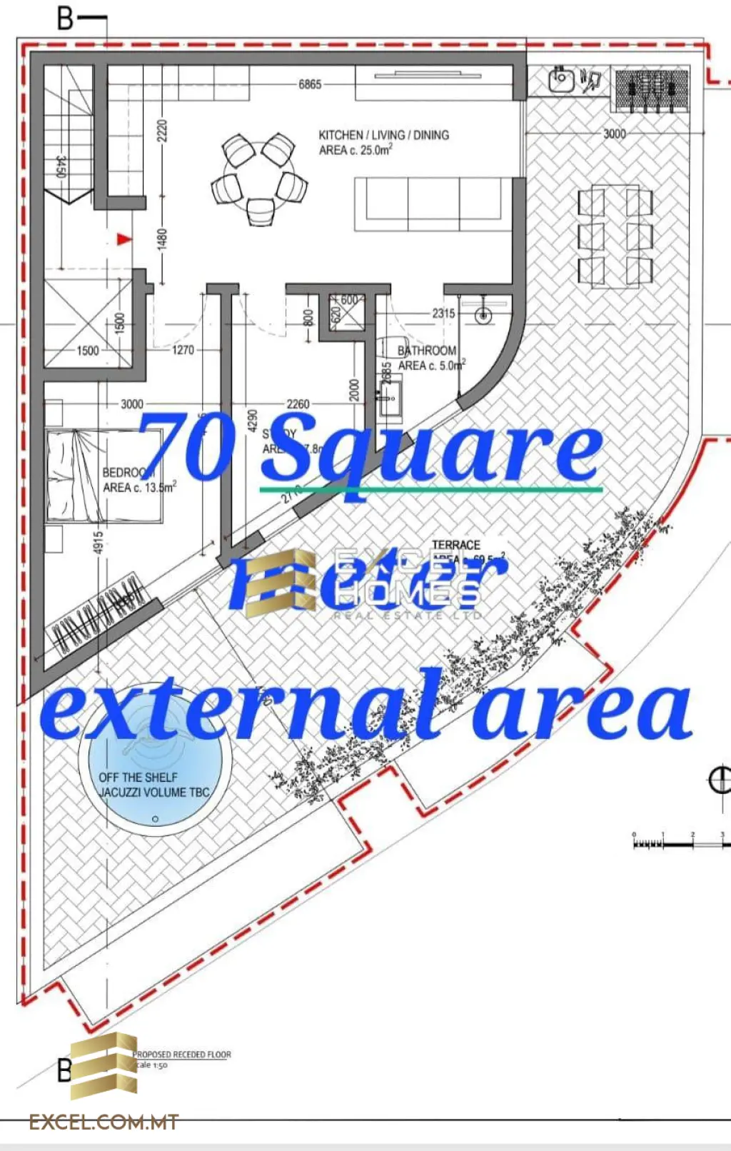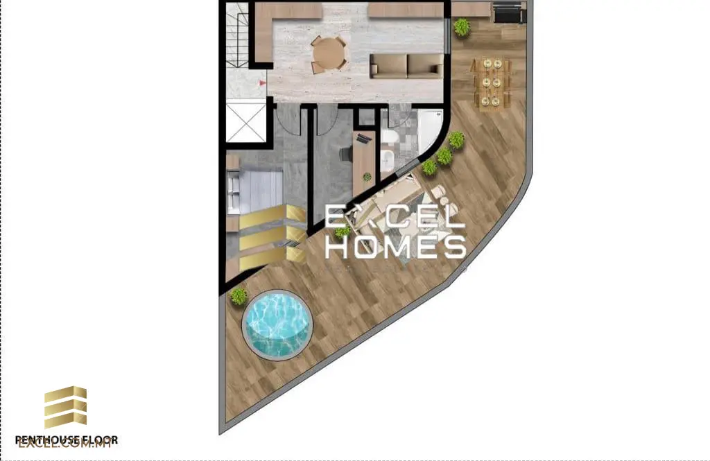 Paola — Penthouse corner with 70sqm external area, consist with an open plan kitchen, living, dining area, main bedroom with a study and a main bathroom. Being sold finished excluding doors and bathroom. Freehold