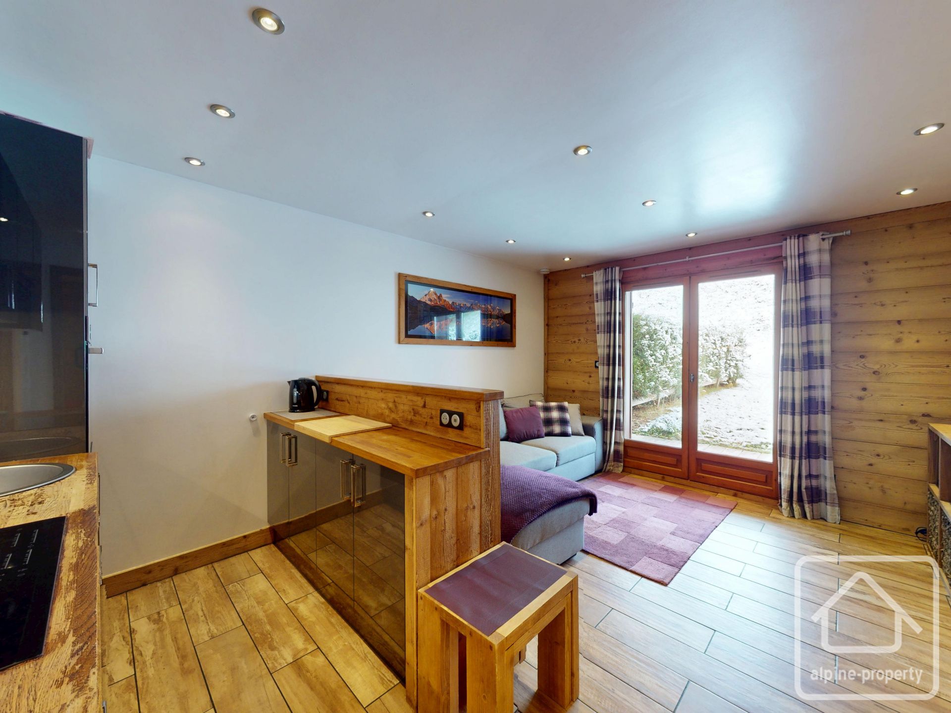 **Layout:** entrance, bathroom, storage and laundry area, fully equipped modern open-plan kitchen with dining and living area opening on to private terrace and garden with views of Mont Blanc. Two double bedrooms with built-in storage.
