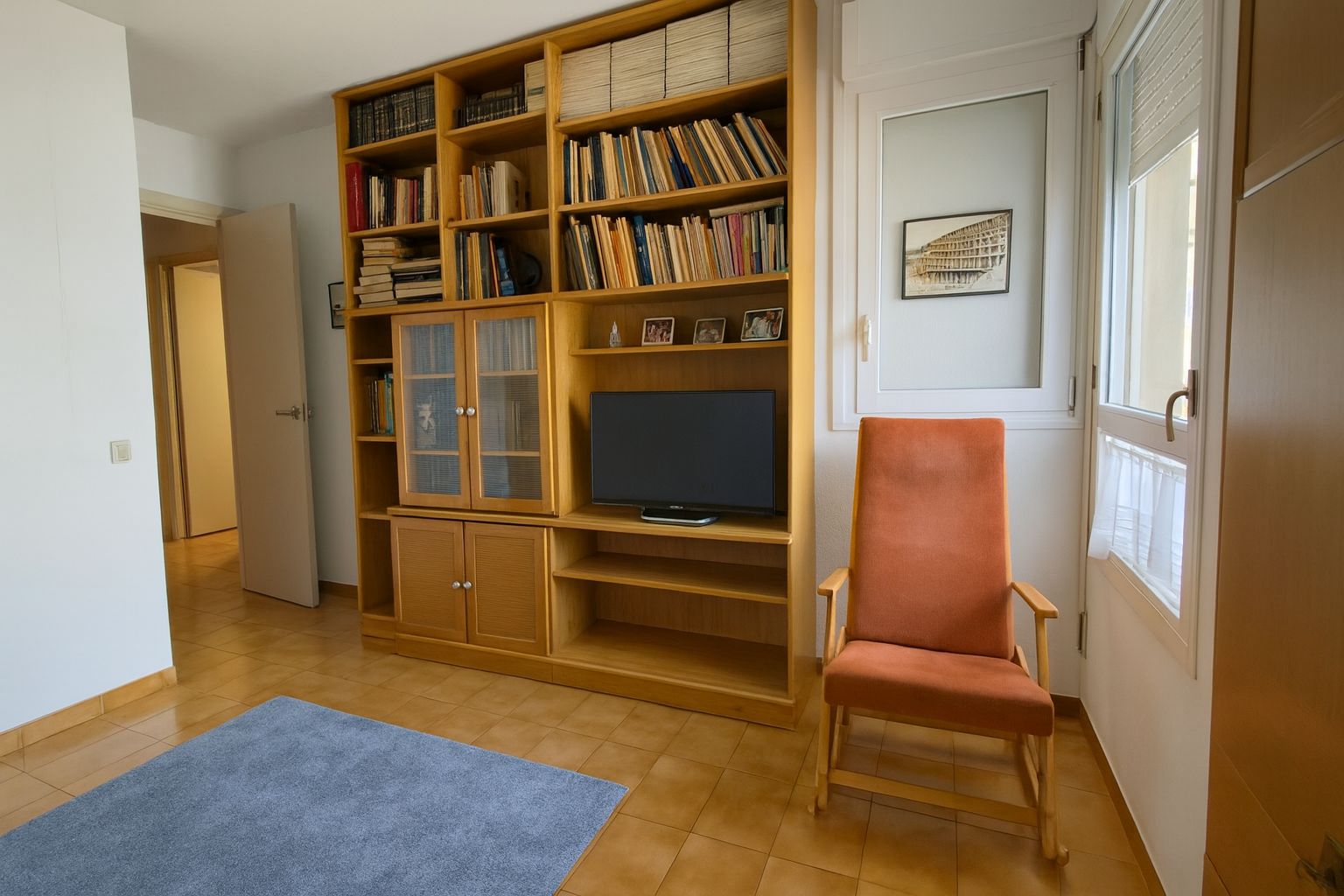 The apartment has three bedrooms and two bathrooms, offering a comfortable and well distributed space for families or those looking for spaciousness. The house has air conditioning, fitted wardrobes and an office, which facilitates telework or study at home. It is delivered completely furnished and with the equipped kitchen, ready to live. Among its features are also the elevator in the building and the general good condition of the property, although it is recommended a renovation to update some of its spaces.