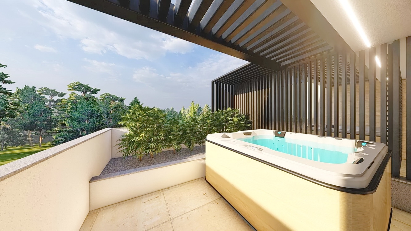 The apartment extends over the ground floor, first, and second floor, with a total area of 83 m². The ground floor features an entrance area, a kitchen with a dining room and living area, a toilet, a staircase, and a terrace with access to the garden. On the first floor, there are two bedrooms, a hallway, a bathroom, and a balcony, while the second floor is reserved for a spacious gallery with a private bathroom and a terrace designed to include a jacuzzi.