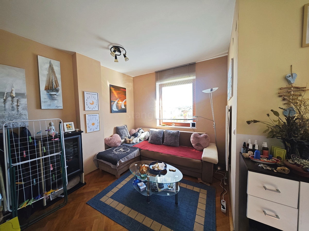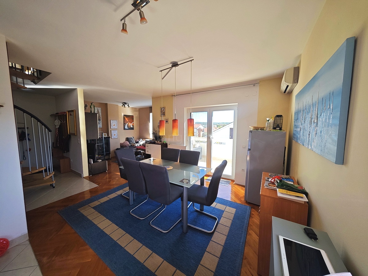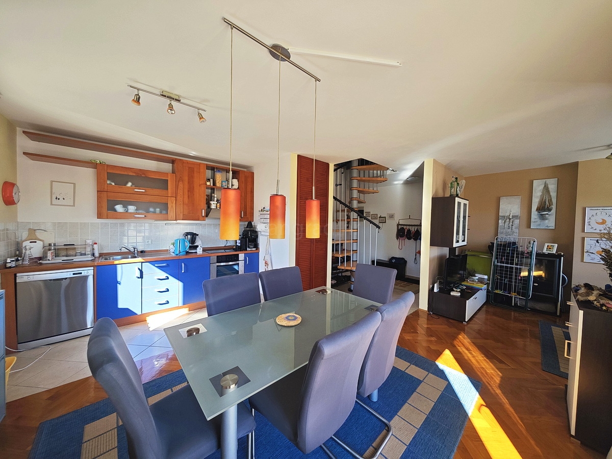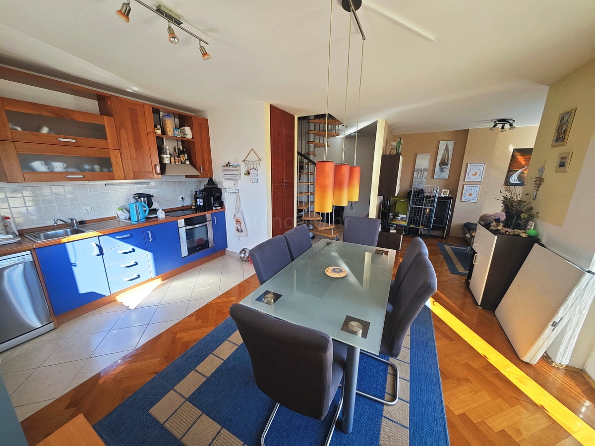 This is a two-story apartment with an internal staircase and an entrance area on the lower floor. Situated in a well-constructed building, the apartment occupies the second floor and the attic, with a total area of 108 m². It consists of an entrance hall, a living room with a kitchen and dining area, a bathroom, and a covered terrace on the second floor, while the attic features three bedrooms and a second bathroom. The interior is very well maintained, fully furnished with quality furniture, and equipped with all necessary technical appliances, making it ready for immediate occupancy or tourist use.