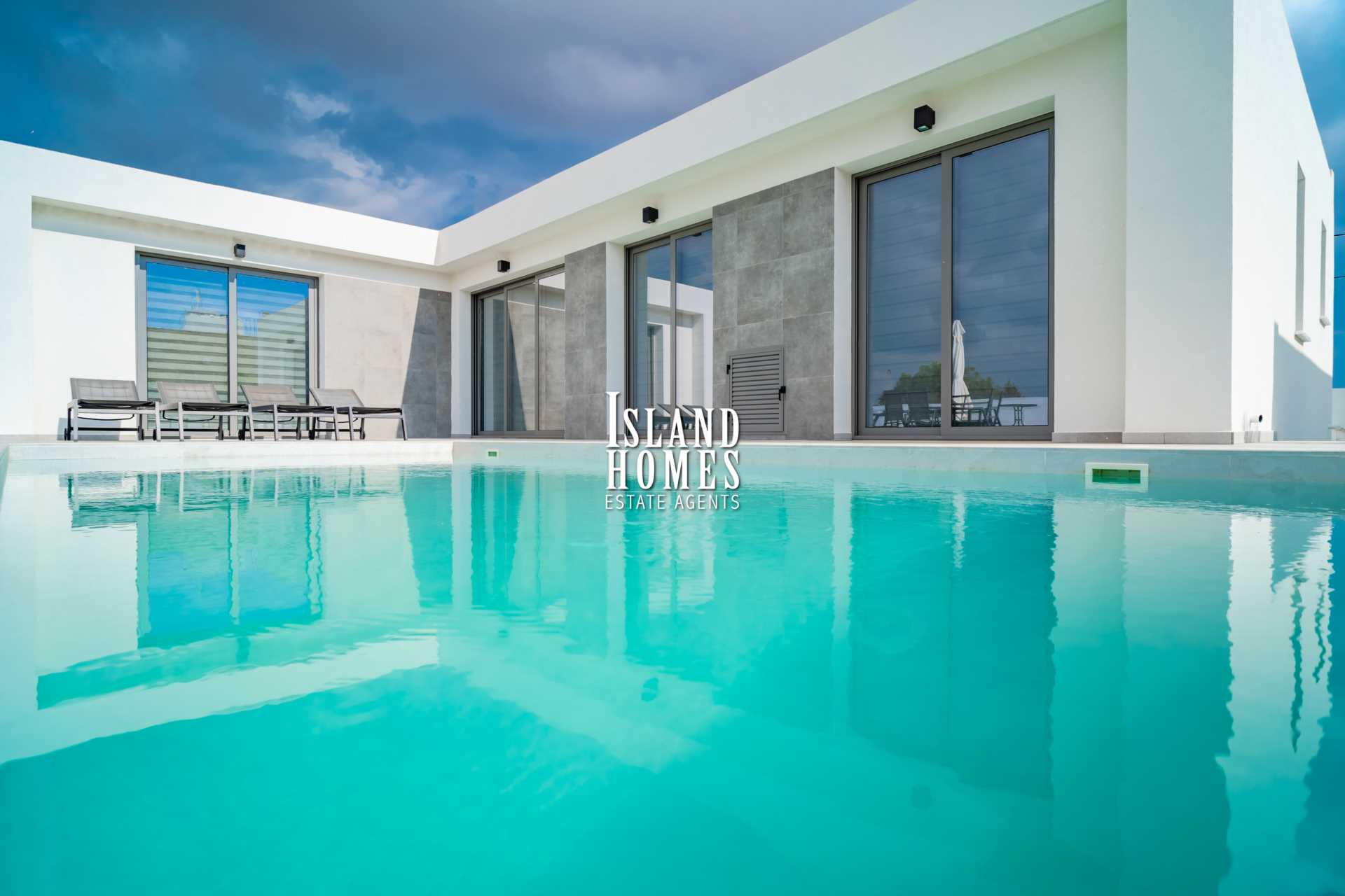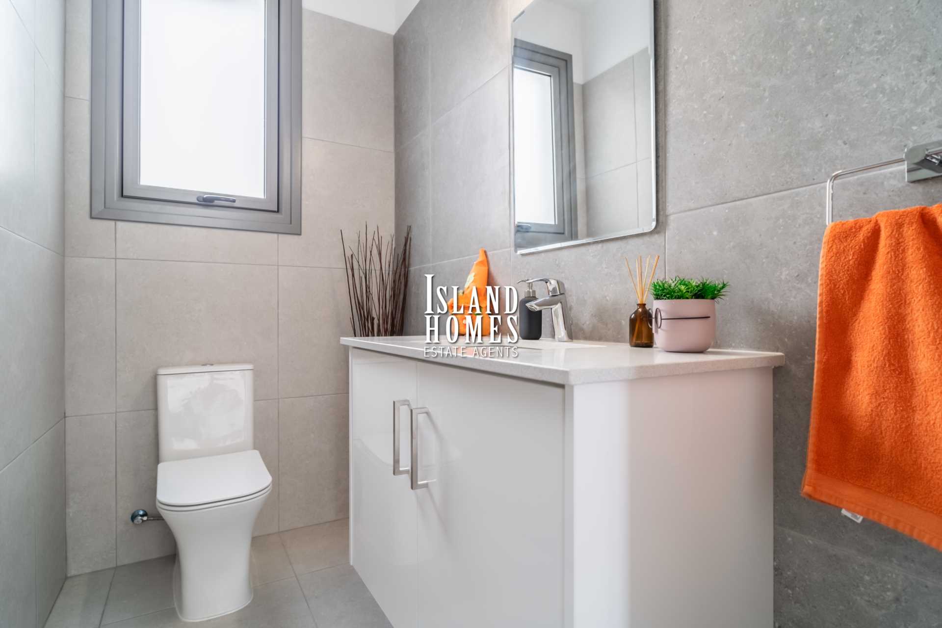 This is a rare opportunity to buy a new build bungalow in a traditional Cypriot village. This modern and minimalist home is offered for sale with electric blinds, ceiling fans and air conditioning throughout. The entrance leads into the spacious open plan kitchen, dining and living area. Your eye is immediately drawn to the triple slide patio doors and the swimming pool and sun terrace beyond. The entrance also includes a partition wall with handy storage, ideal for shoes, jackets, luggage or cleaning equipment.