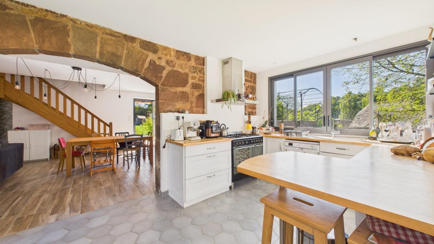Be captivated by this charming stone house from the Rougier region, enhanced by two timber-framed extensions, offering approximately 100 m² of living space on a 1,756 m² plot. Located in the commune of Nauviale, close to all amenities, this fully renovated house boasts high-quality features. Its unique architecture, blending old-world charm with contemporary touches, is sure to win you over. On the ground floor, you’ll find a warm and inviting living room of approximately 32 m², complete with a wood-burning stove, opening onto a bright and well-appointed kitchen of approximately 13 m². This level also includes a master bedroom of approximately 13 m², with an en-suite bathroom of approximately 6 m², as well as a separate WC. Upstairs, you will also find two bedrooms of approximately 11 m² and 13 m², as well as a bathroom with a toilet. The house benefits from excellent insulation, guaranteeing low heating costs. The two timber-framed extensions were built in 2017, and the main structure is in perfect condition, with a roof that was completely redone in 2022. It is equipped with double-glazed windows, a hot water tank, fiber optic internet, and is connected to mains drainage. The house also has a small outbuilding of approximately 10 m² and a wooden shed. Building a garage is entirely feasible, as planning permission has already been granted. The land is divisible and is located in a buildable zone. Don’t delay in discovering this rare property in the area. A virtual tour will soon be available upon request. Information on the risks to which this property is exposed is available on the Georisques website: www.georisques.gouv.fr