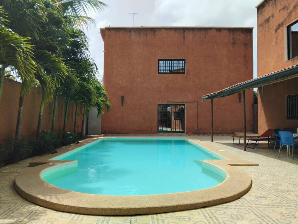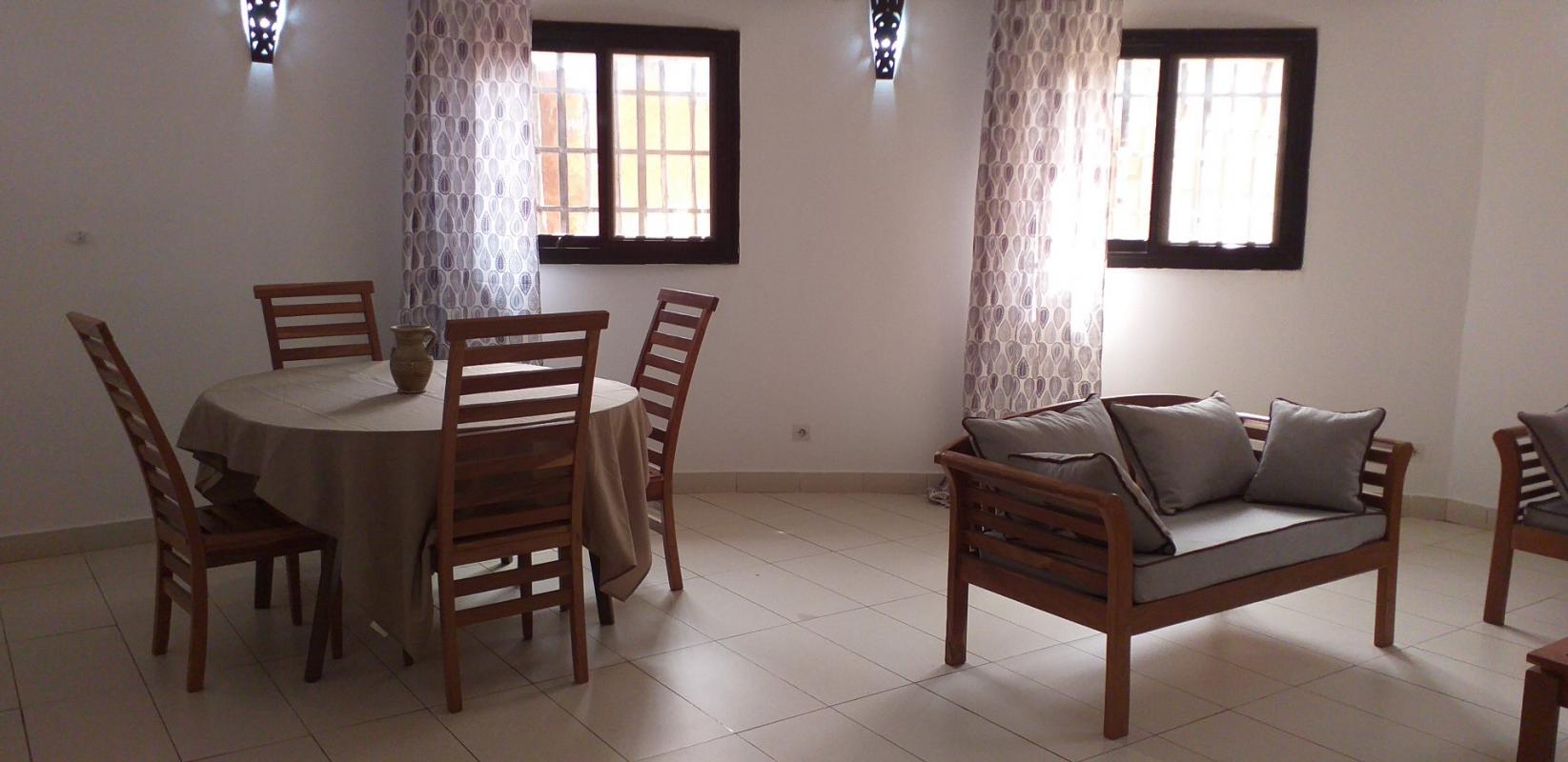 Ideally located 150m from the road and close to the Ngaparou roundabout, with all shops nearby, this large, comfortable 175m2 ground floor apartment offers all the advantages of a detached villa. Featuring a beautiful swimming pool surrounded by large terraces for lounging, the fully furnished, equipped, and air-conditioned apartment consists of an entrance hall, a living-dining room, a separate kitchen, a guest toilet, and 3 bedrooms with en-suite bathrooms, including a master bedroom with a dressing room. TV, Canal +, and fiber optic cable are installed. Indoor parking. Water tank and booster pump. Water, Wi-Fi, and caretaker are included in the rental price.