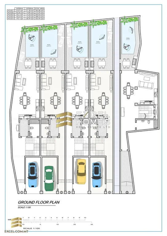 The project is made up of 5 Terraced Houses with a private pool and yard each, 4 of which include a street level garage.