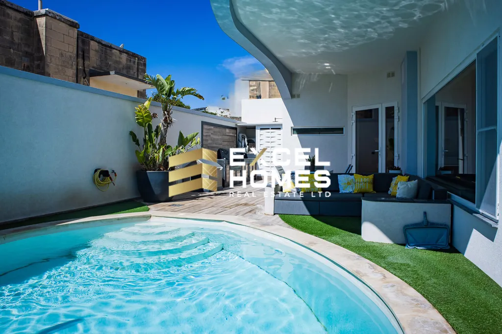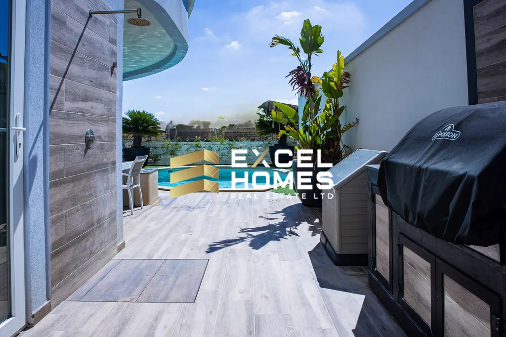 The elevated ground floor is ideal for indoor-outdoor living, with a private pool, BBQ area, and a bright open-plan layout that includes a modern kitchen, living area, and guest bathroom. The first floor offers three double bedrooms, two with en-suites and walk-in wardrobes, plus a main bathroom. The second floor includes a washroom, drying area, and roof access.