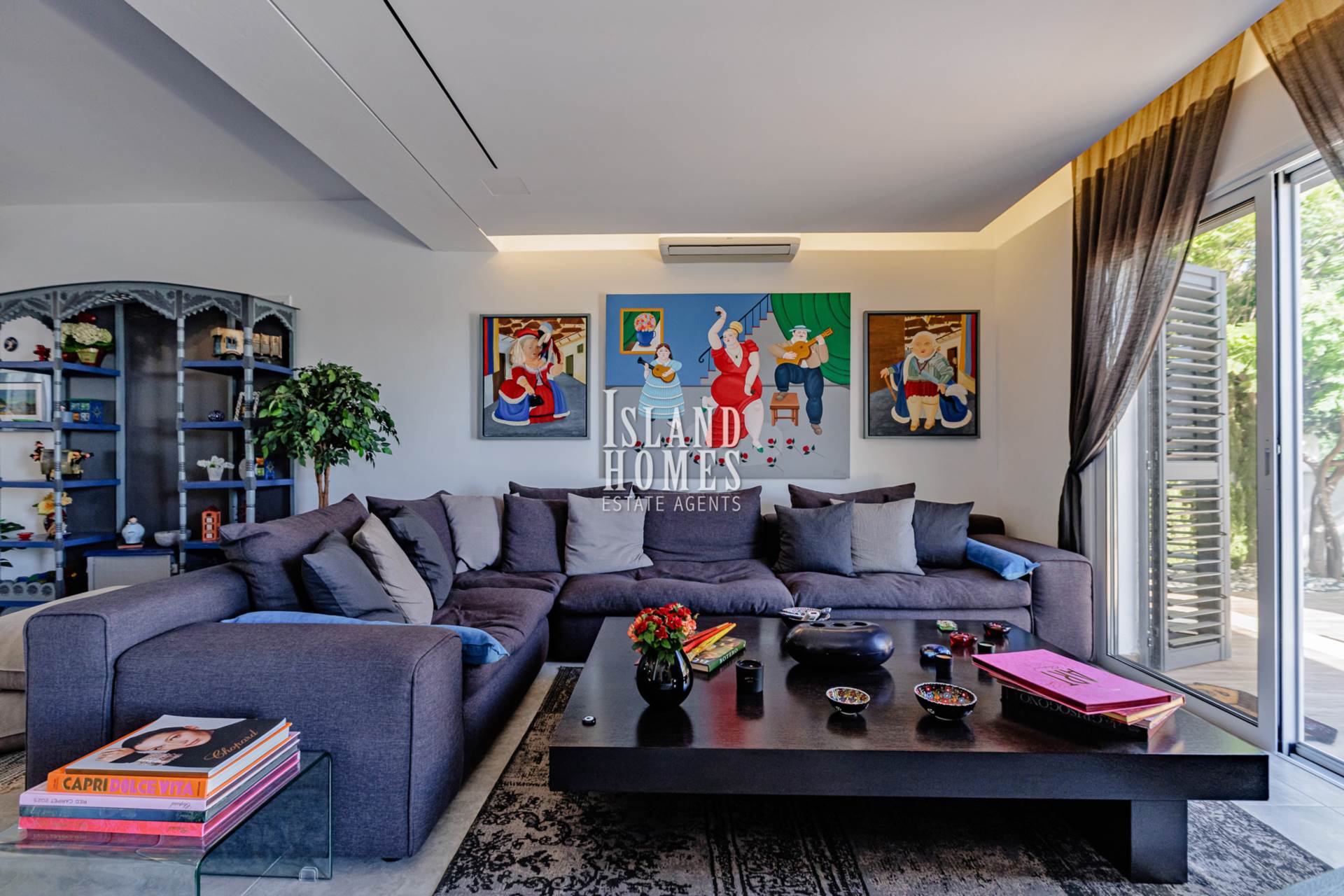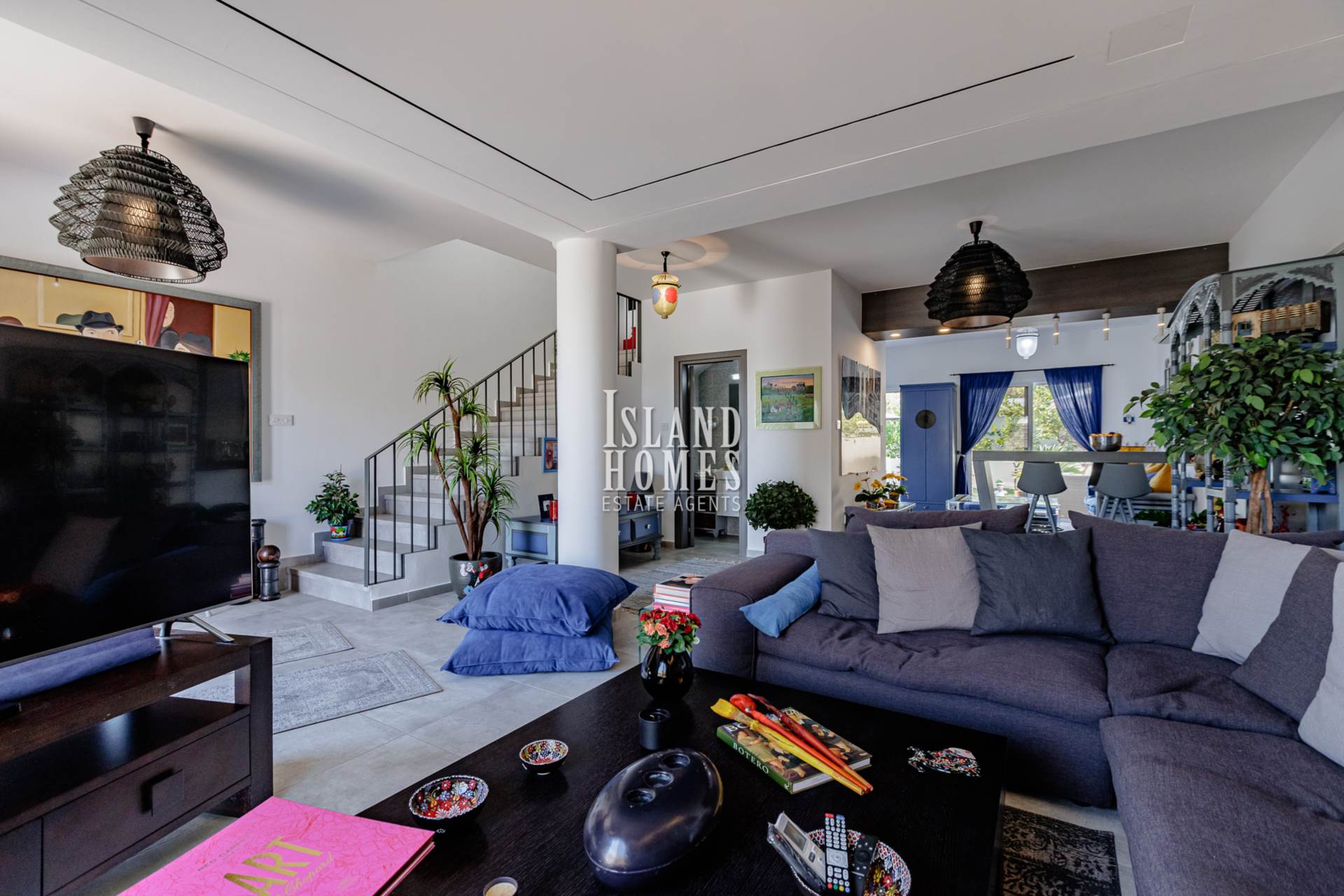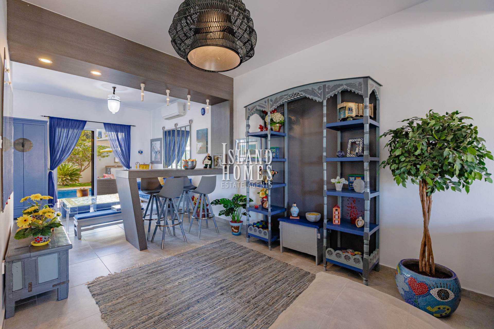 This is a fabulous opportunity to own a superbly presented property in a sought after area overlooking Ayia Napa. Situated on a small complex of 8 other similar properties, the gated driveway leads to a wraparound plot which offers a fabulous raised front veranda. The entrance door opens into a beautifully presented and welcoming open plan ground floor.Every detail in the house and grounds has been carefully thought out by the current owners. With a spacious feel and a stylish partition breakfast bar the living space is a cosy and inviting area. From the breakfast bar there is a snug area adjacent to the kitchen. The spacious kitchen is well laid out and equipped with brand new, high end appliances and offers plenty of natural light from two sets of windows. The kitchen includes direct access to the garden and the snug area also includes patio door access with a pool view. The ground floor includes a handy guest WC.