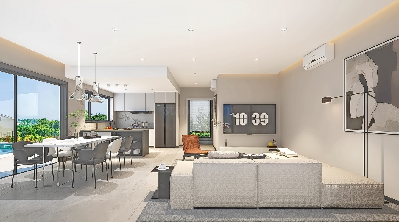Adding further value to the property is the landscaped garden, enhanced with a 24.5 m² swimming pool, a sunbathing area, and a gazebo. The garden also offers comfortable parking space for two cars. In addition, the villa boasts a beautiful panoramic sea view. The planned completion date for construction is October 2026.