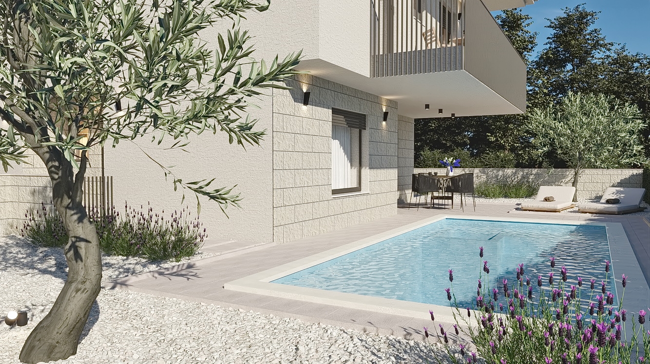The landscaped garden of approximately 180 square meters adds significant value to the property. It includes a 21-square-meter swimming pool equipped with electrolysis, a heat pump, and a sunbathing area. The contemporary Mediterranean style is emphasized by stone boundary walls and tasteful stone details on the facade and around the house.