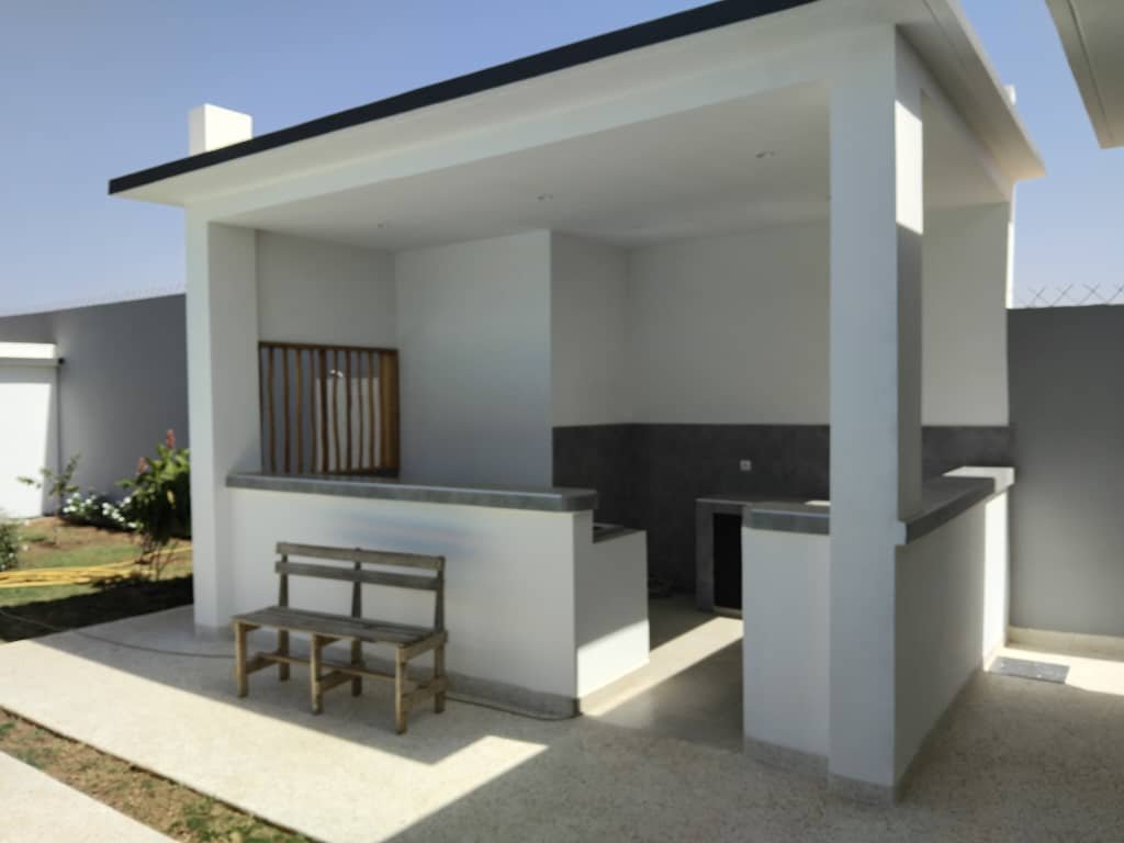On a plot of 600m2, beautiful new furnished villa built in 2024 with a living area of 160m2 including 3 bedrooms, 3 bathrooms, a living room with dining room, an equipped US kitchen, a laundry room, a second outdoor kitchen, a covered terrace, an 8X4 swimming pool and a storage room. The villa also includes a caretaker’s house with shower room, 2 indoor parking spaces and a borehole with booster pump. It is located in a new residential area 1km from the AUCHAN Saly Center shopping center.