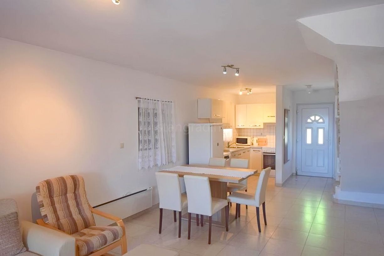 The property is divided into two completely separate residential units. On the ground floor, there is a one-bedroom apartment featuring a living room, kitchen with dining area, bathroom, bedroom, and a spacious terrace with an open view of the sea. The first and second floors accommodate a two-level apartment with a living room, kitchen with dining area, bathroom, an additional toilet, two bedrooms, and another terrace offering a beautiful view of the sea and surrounding landscape. The interior of the entire house is well-maintained, fully furnished, and equipped with quality appliances and furniture, ready for immediate use without any further investment.