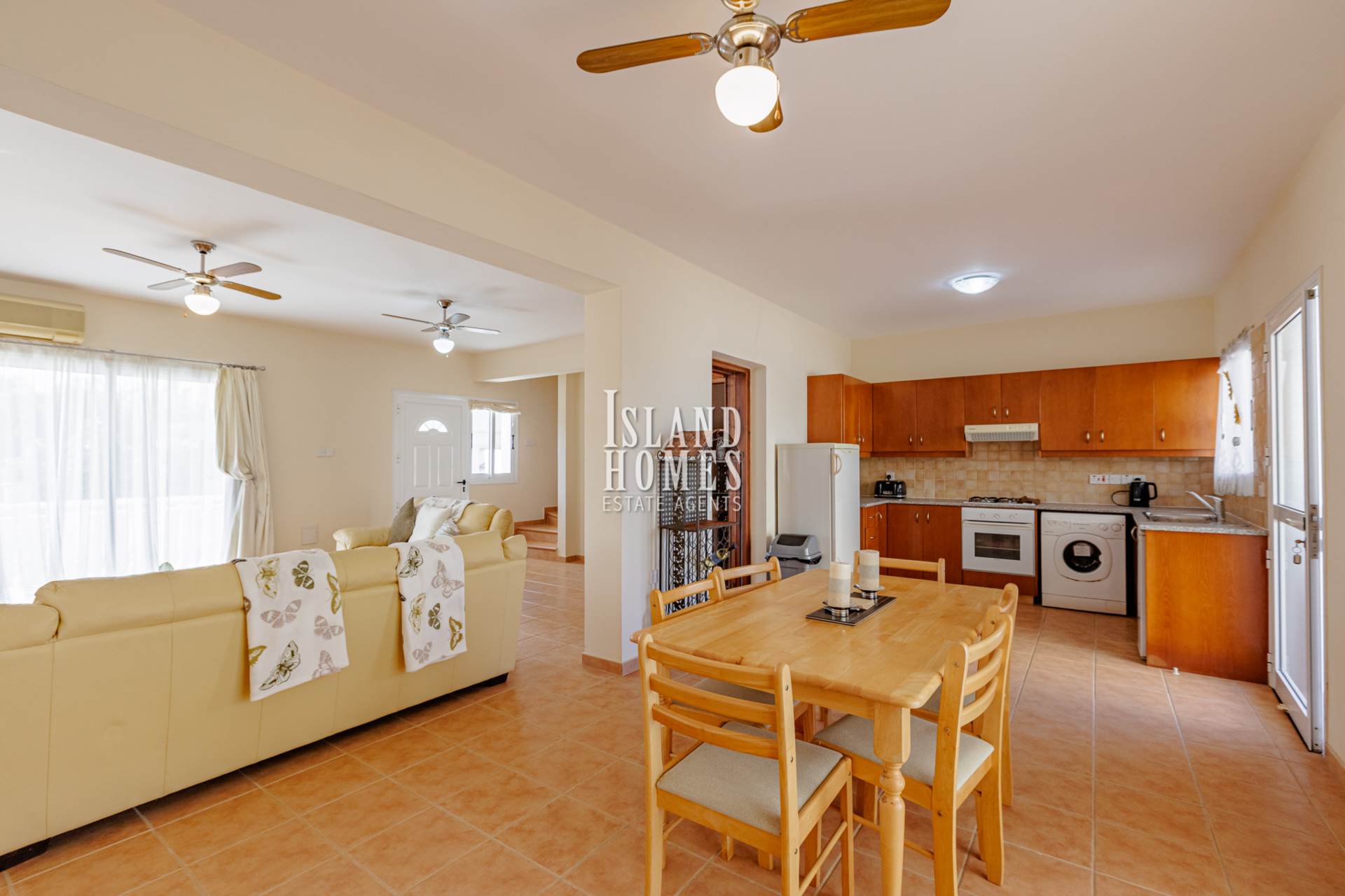 This is a superb opportunity to own a village retreat. Tucked away in the popular village of Xylofagou this delightful property offers so much space. The gated entrance allows access to the private garage with dual roller shutter doors giving the opportunity to use this space as a covered seating area during the warm summer months. The front door leads into an open plan living, kitchen and dining area. The good size kitchen is U shape in design and offers plenty of natural light from the window above the sink. The living and kitchen area have a small partition wall giving character to the room the living room includes patio doors to access the raised front veranda. The ground floor includes a handy guest WC as well as a built in under stair storage, ideal for keeping cleaning equipment out of the way.