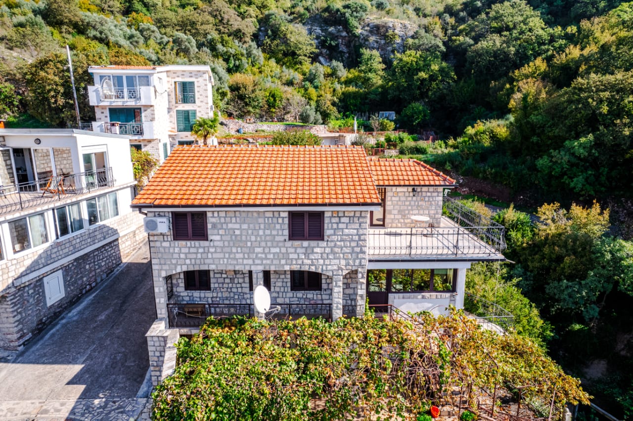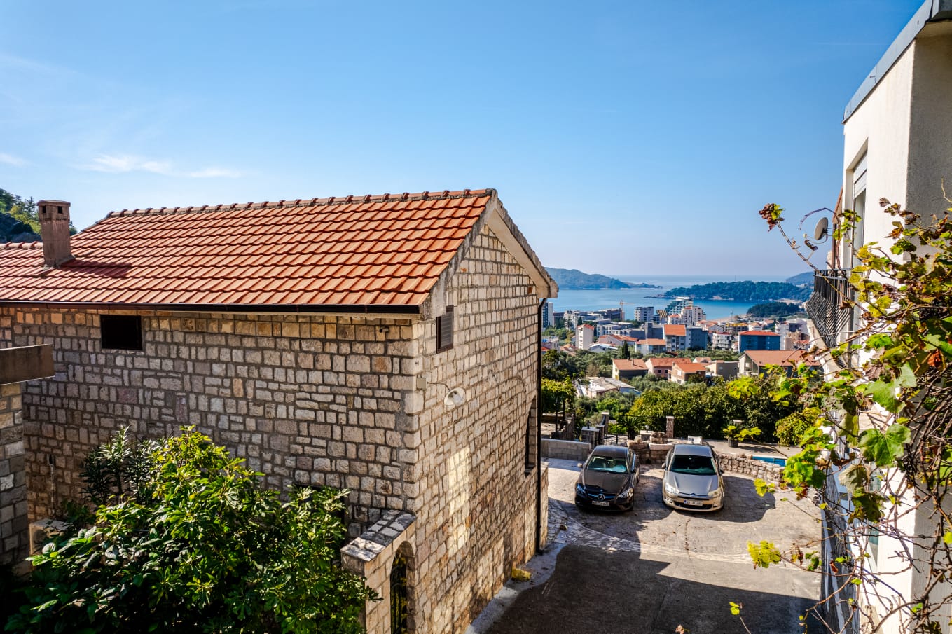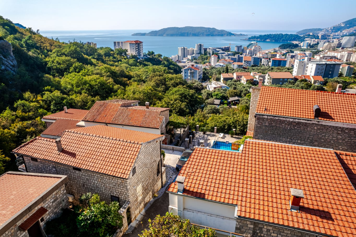 Enjoy the stunning views of Bečići Bay, a beautiful courtyard with grapevines, and direct access to nature, with a forest-covered hill, waterfall, and stream bordering the property.