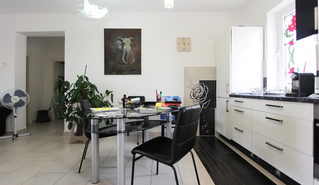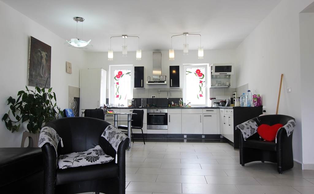 • on the first floor there are four bedrooms, two bathrooms and a kitchen combined with a living room;
