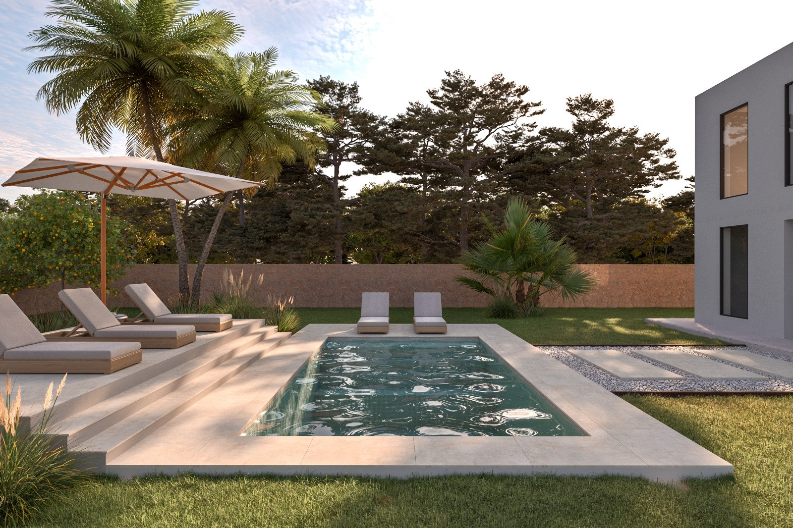 The approved project includes a residence with four bedrooms and four bathrooms, with a total built area of 278.6 m² and an interior of 249.7 m². The layout of the villa is designed to maximize comfort and functionality, allowing for spacious indoor and outdoor living areas. The property also features a private garden and a private garage, adding value and comfort to the future residence.