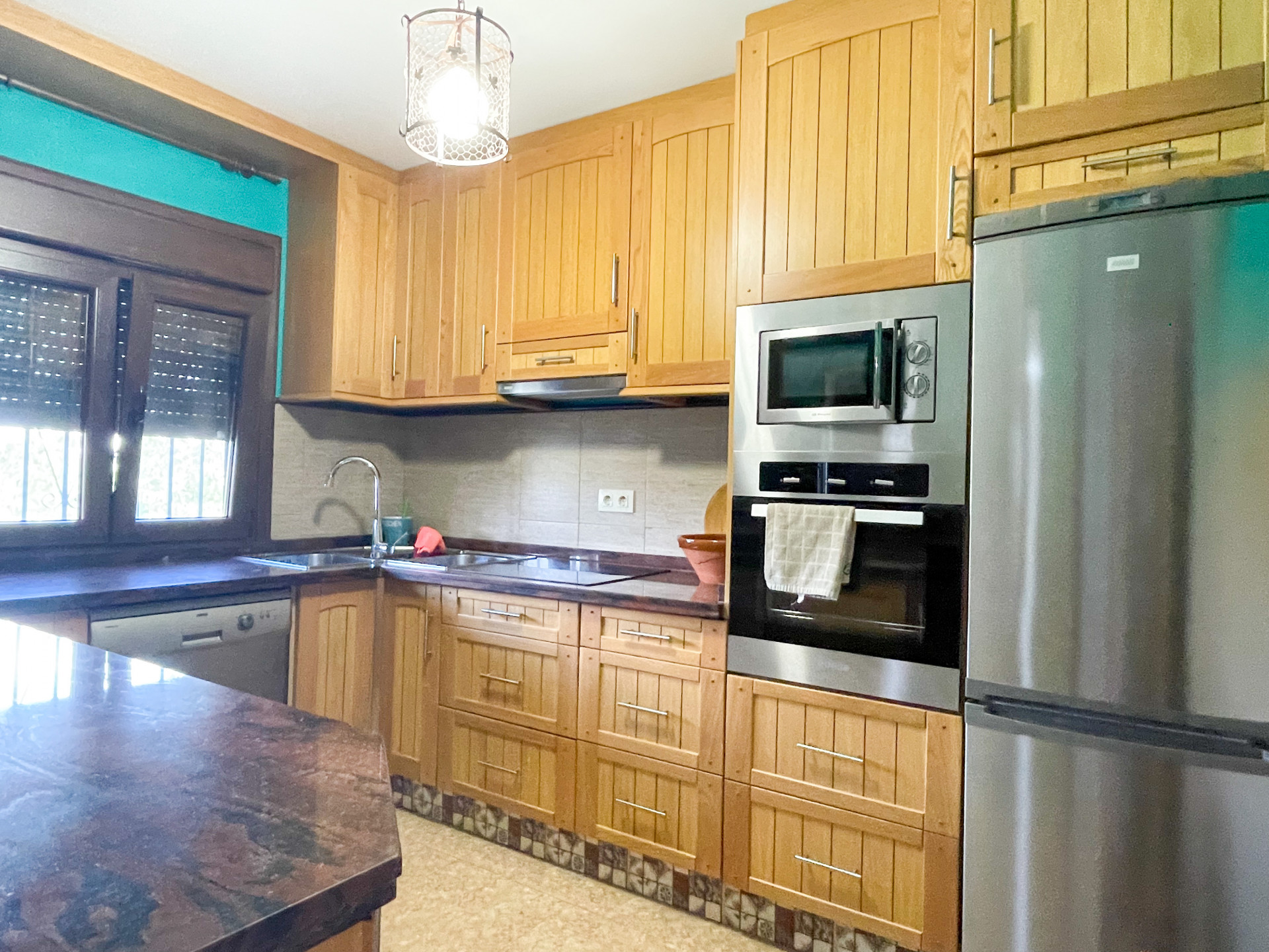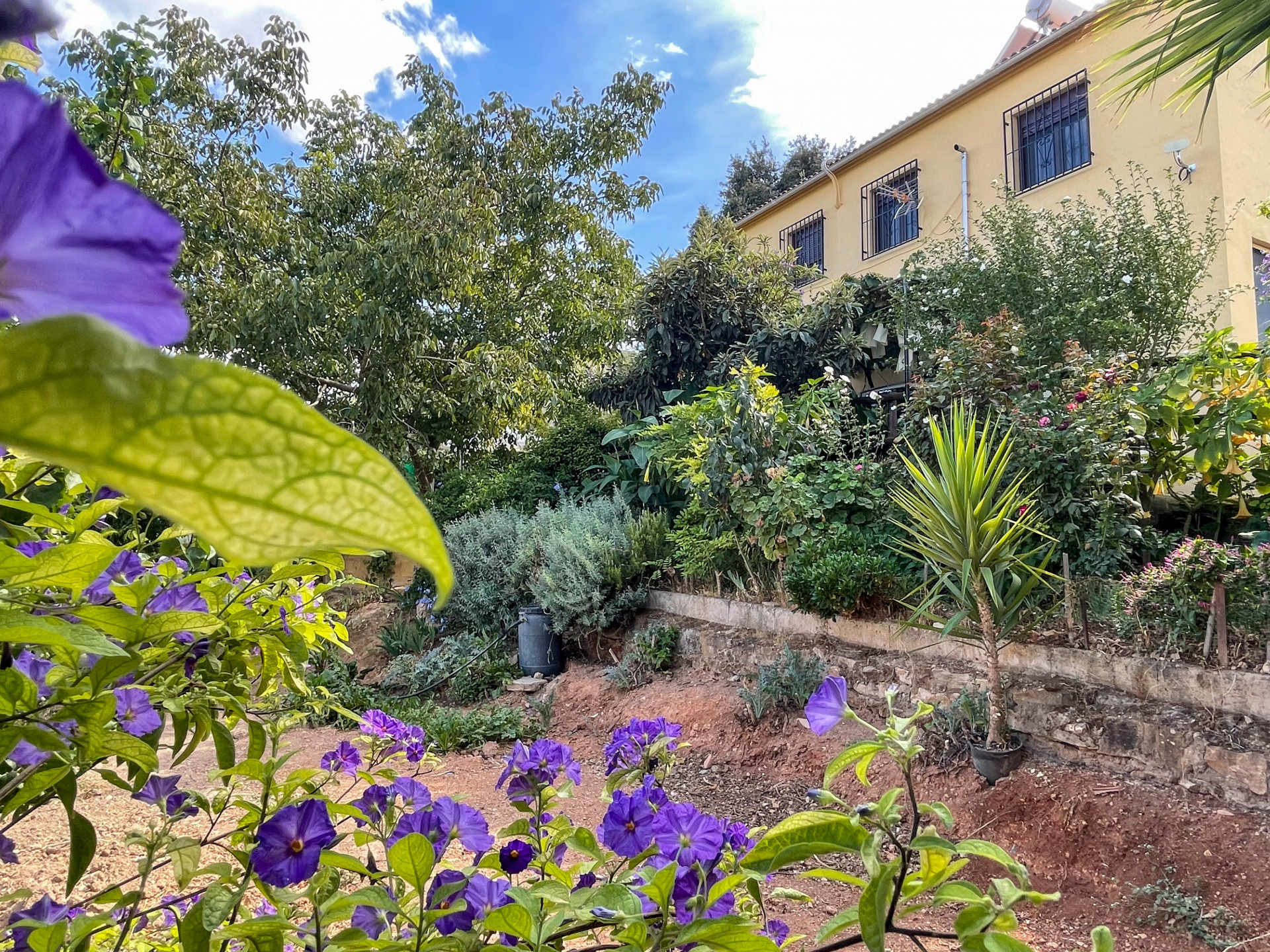 Down the steps you have a large space, where you can do a seperate apartment as the garage enters from that level too, they can have their own entrance to the property. There is also one bedroom and good sized ensuite bathroom. There is also a store room and then a door that leads outside to the terrace area with barbecue. There is a lovely garden with many flowers, a lovely shaded seating area with views to the distant hills, a grape vine which offers shade to park a car. At the bottom of the garden you have a pool with a terrace around it. Here you can enjoy many summer days.