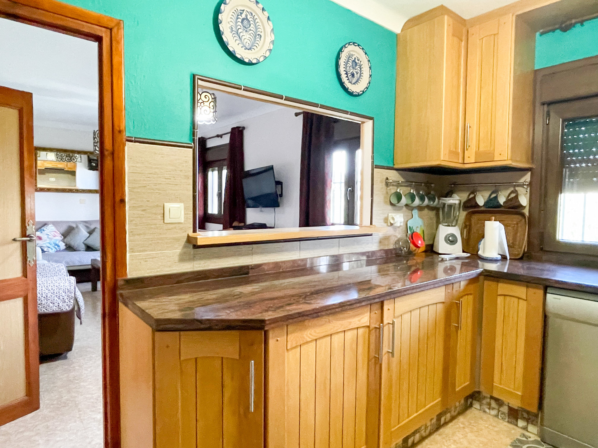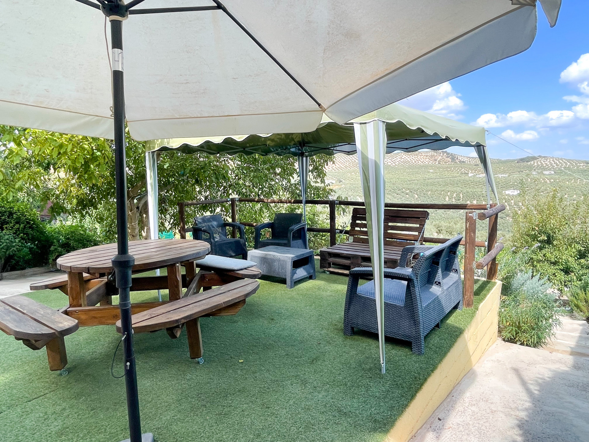 This property is located about 10 minutes drive from iznajar town, located in a small village. The proeprty is just off the road . As you enter the mian door from the road, you have a small hall way. Off the hallway are 3 good sized bedrooms, a bathroom, kitchen and sitting room with a pellet burner and windows to the back of the property facing the lovely garden and views of the rolling hills of the surrounding olive groves.