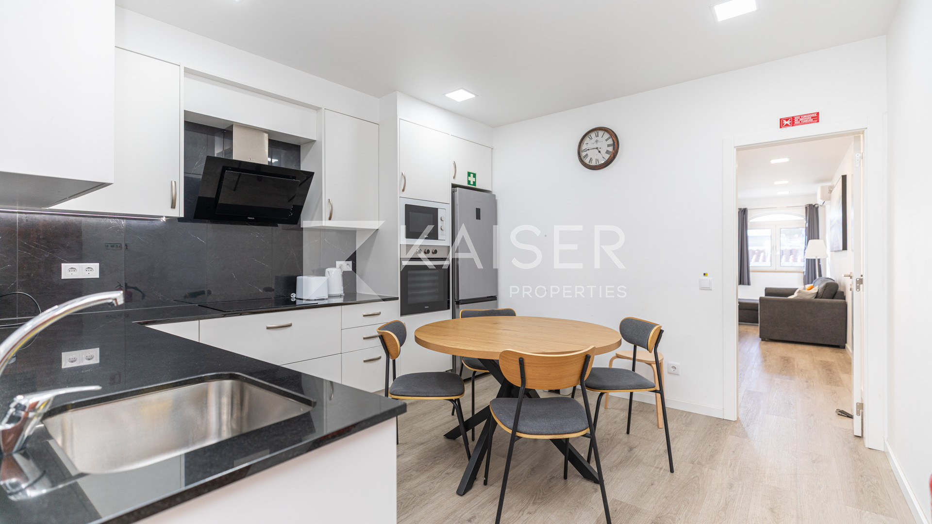 Ground floor: Bright open-plan living and dining room, fully equipped modern kitchen, 2 comfortable bedrooms, and a bathroom.