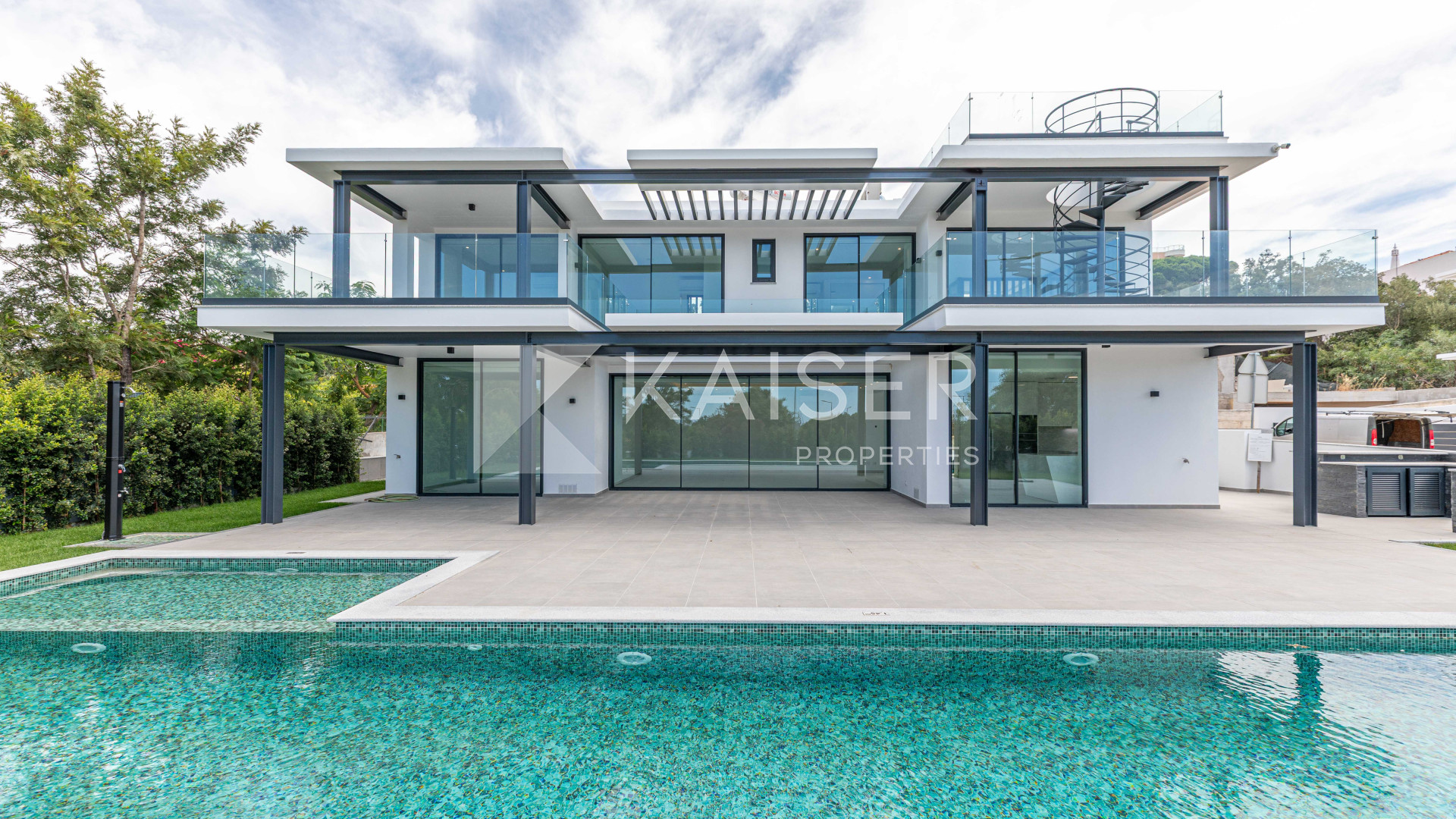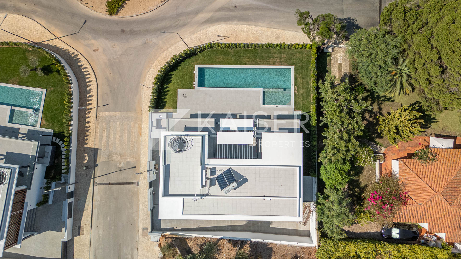 This property features air conditioning in every room, electric underfloor heating, controlled mechanical ventilation, solar panels for hot water, electric blackout curtains, tempered low-e glass and automatic irrigation.