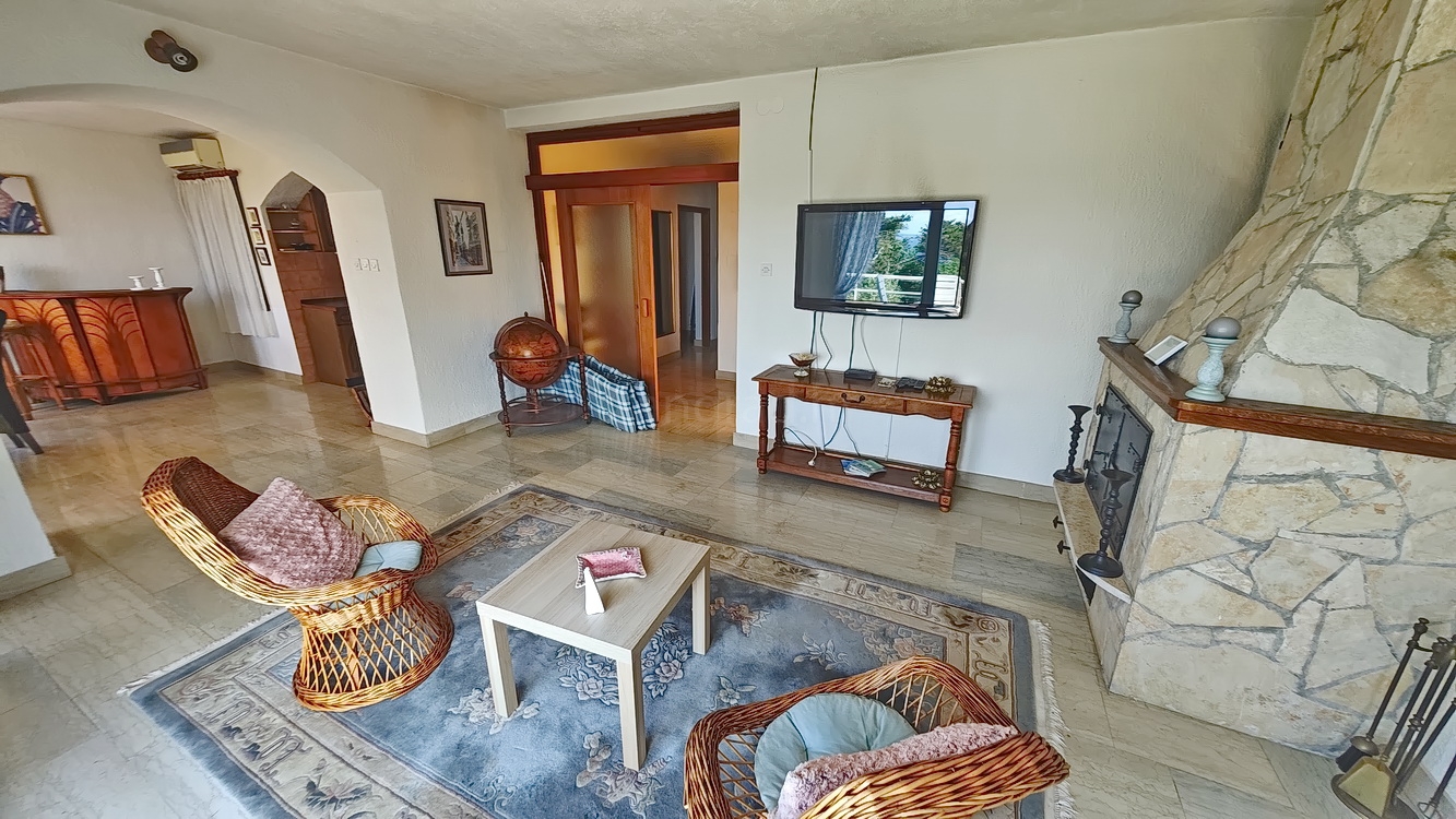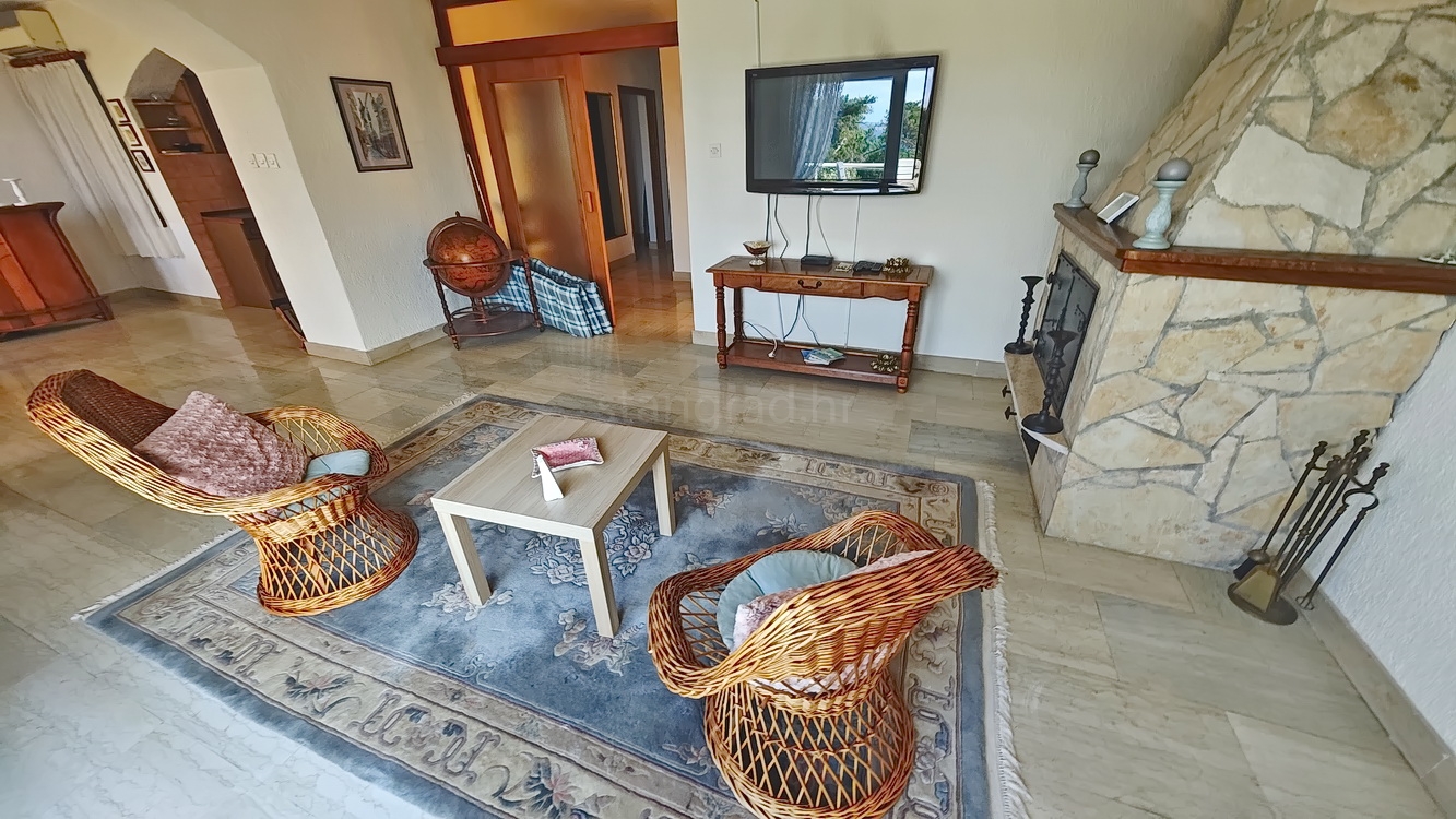 It is important to note that the apartment on the first floor occupies the entire level and consists of an entrance hallway, two bedrooms, a living room, a kitchen with a dining area, and a large terrace with a sea view. The interior spaces of the property are exceptionally well-maintained and fully equipped with necessary technical appliances and high-quality furnishings.
