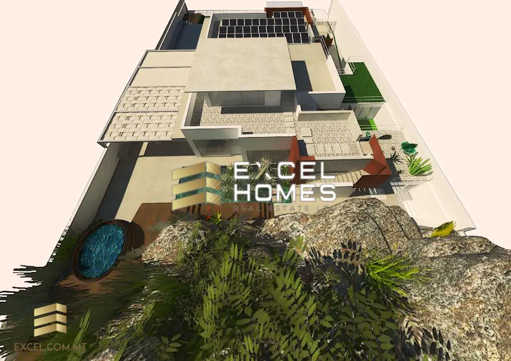 A plot of 1,565 sqm with permits in hand to build a wonderful, luxury fully detached villa – designed to perfection, detail and style. Access to two roads and spread over 3 floors. The Villa comprises of 4 bedrooms – all with ensuites, (master with walk in wardrobe and outdoor shower). Very large open plan living/dining, separate large kitchen area that all enjoy sea views and country-side views. L shaped infinity pool, wrapping around the living area. There is second natural pool at the back of the house set in a rock garden, with views of natural fauna, rock and Victoria Lines. On the Ground floor, there are 3 of the bedrooms, a wine cellar, gym, entertainment and games area and kitchen and dining area. On the lower level one finds a large independent 1 bedroom flatlet with full living/kitchen/dining and shower room and an 8-10 car garage. On the highest level, there is a washroom, which is designed as a study, having Great views. There is a lift and a central courtyard and one may have a tree growing through the courtyard or simply use the courtyard as open air living space and for added ventilation and cooling. Excavation, dumping, piling and retaining walls have been completed. Construction may commence.