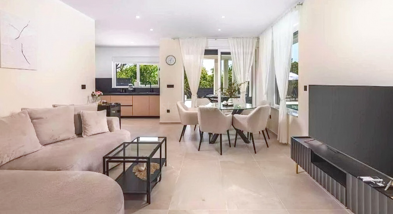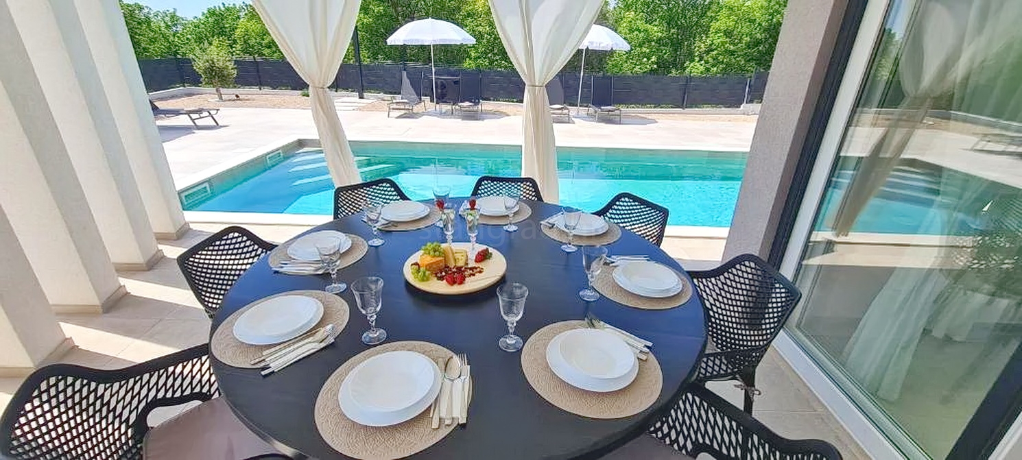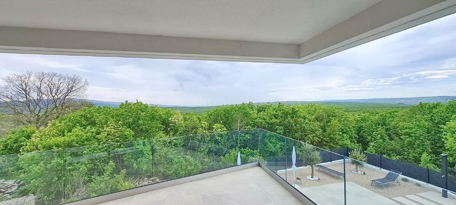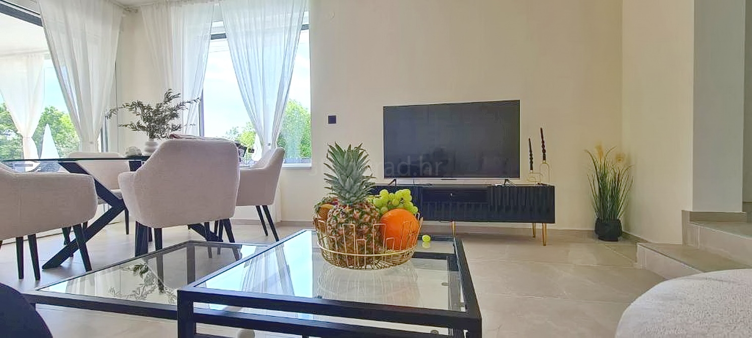 From our agency’s wide selection of properties on the northern Adriatic, a modern tourist house stands out, located in one of the most sought-after regions of the Croatian coast, on the island of Krk. The property is situated in a peaceful and green area near the well-known town of Vrbnik, on the edge of the construction zone, far from city noise and ideal for those seeking a blend of privacy, nature, and comfort.