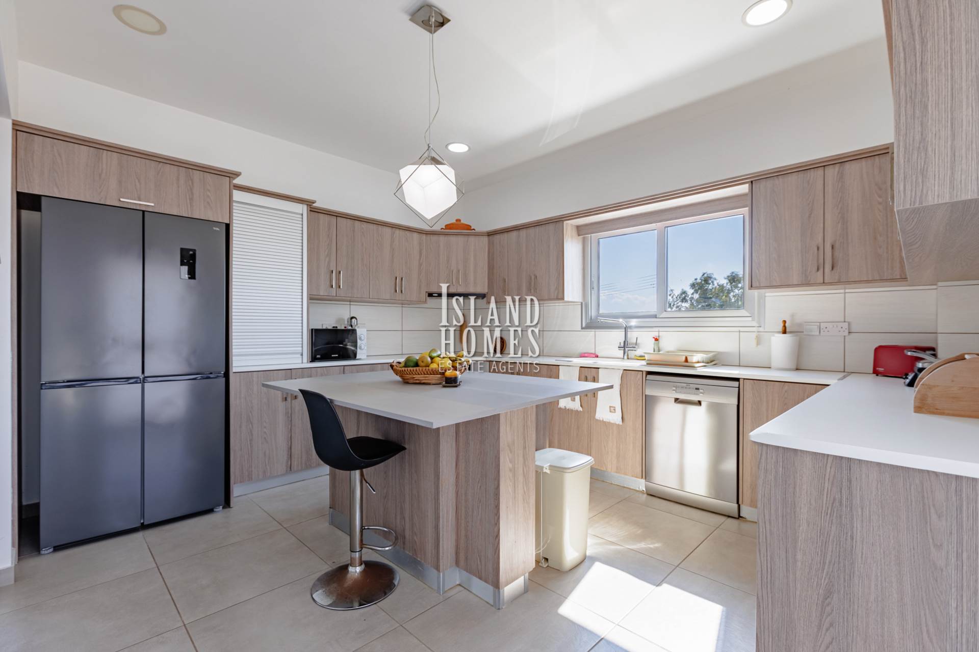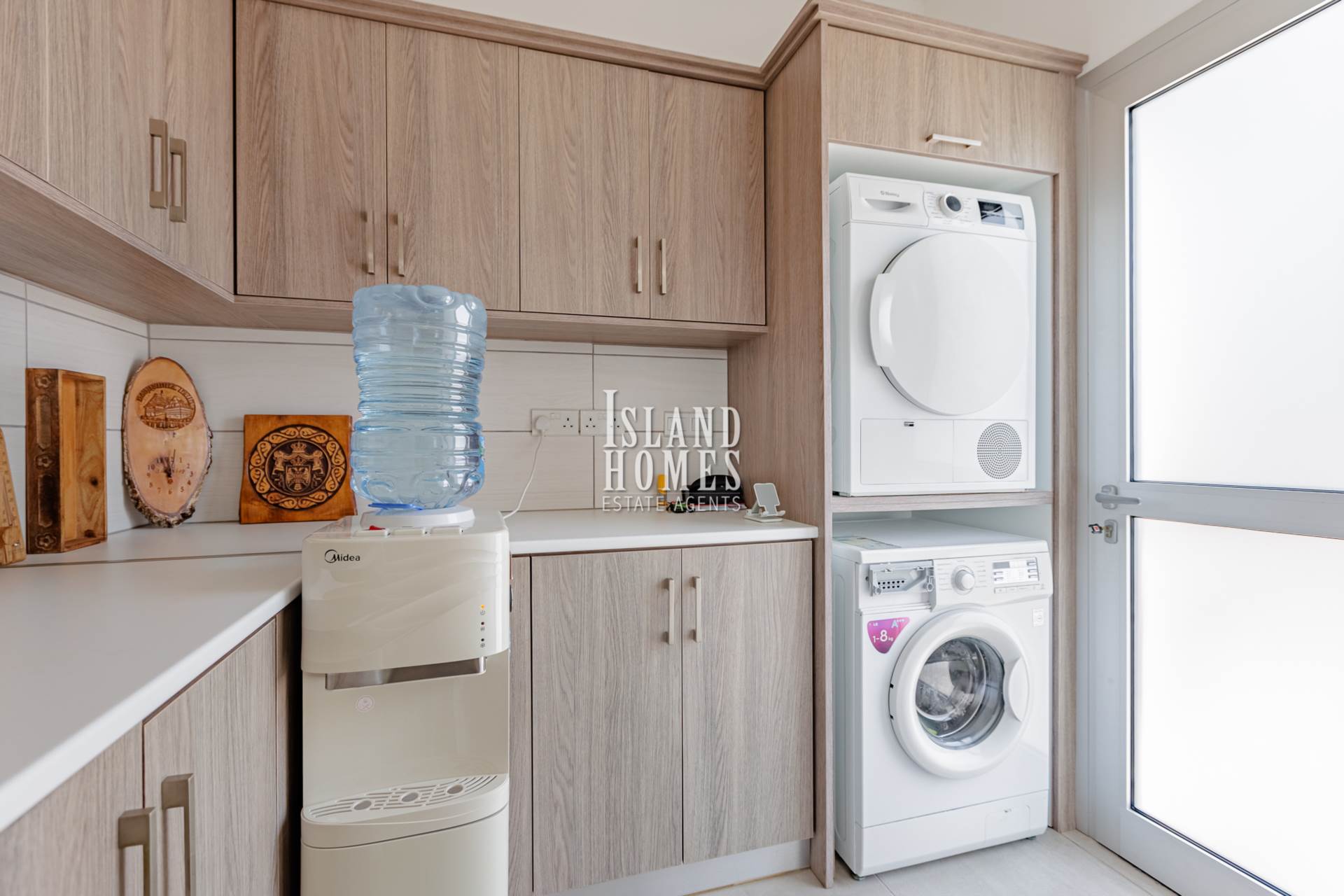 Set in the hills overlooking Ayia Napa, this stunning villa sits on a large 1022m2 Sea View Plot. The interior has been completed with a high quality, modern finish. At ground floor level is the spacious open plan living and dining area, offset kitchen, guest wc, ground floor bedroom and under stair storage cupboard. The fully fitted kitchen boasts an island for food preparation and informal dining and there is a separate utility room for laundry and additional storage.