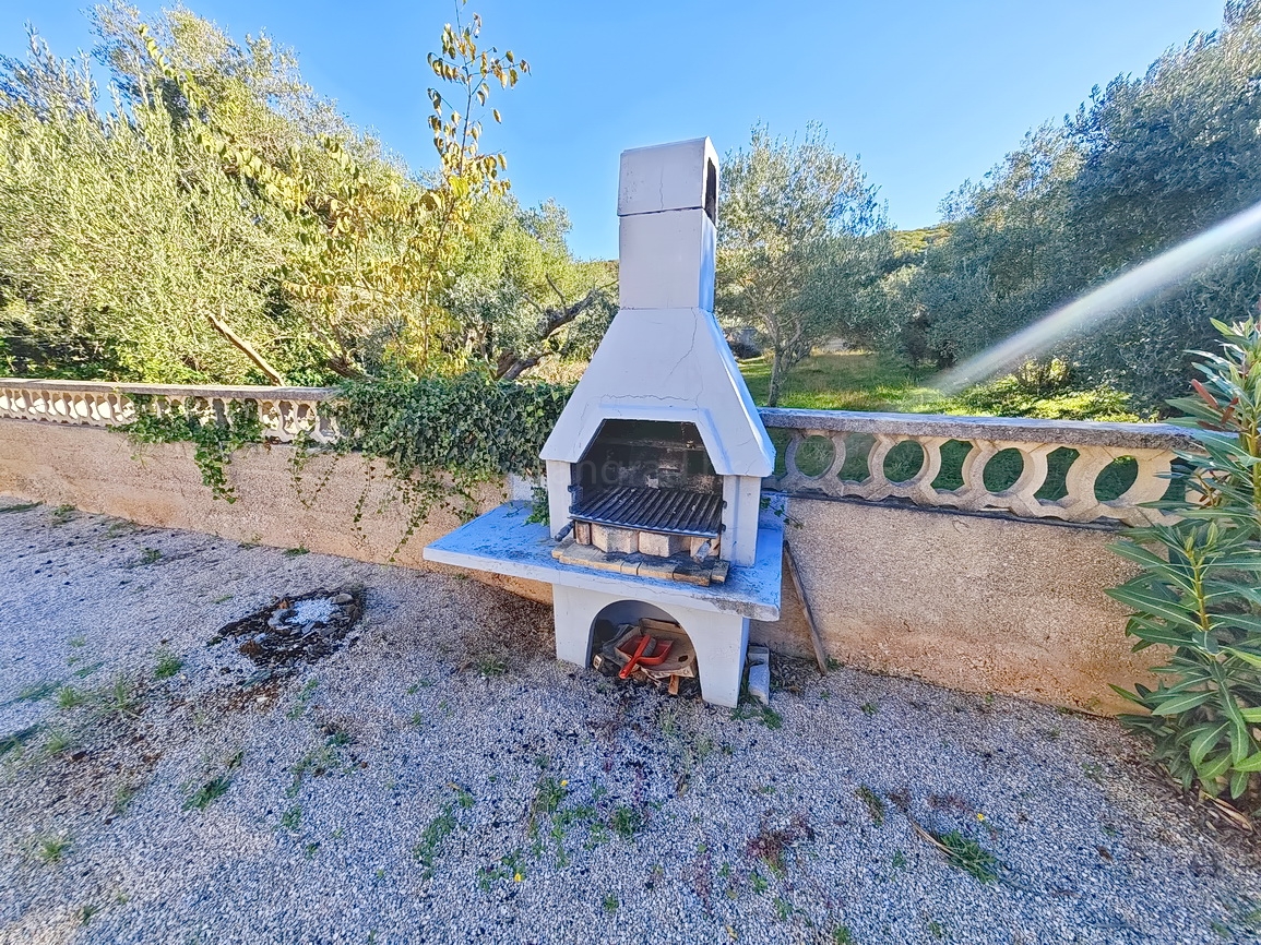 The property includes a beautifully organized yard with a barbecue area, garage, and an auxiliary building of 25 m² containing a kitchen, bedroom, and bathroom, as well as a swimming pool with a sunbathing area. Covered parking within the yard allows comfortable parking for multiple vehicles. Additionally, the house offers lovely views of the coastal town.