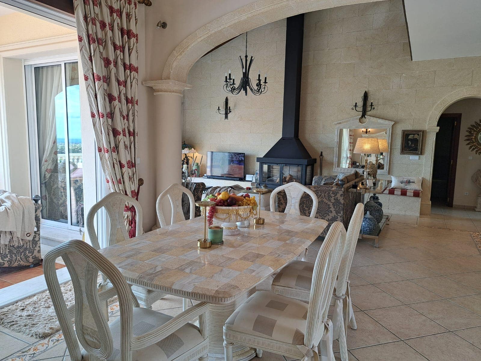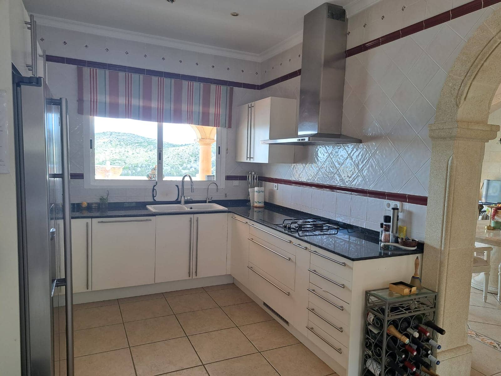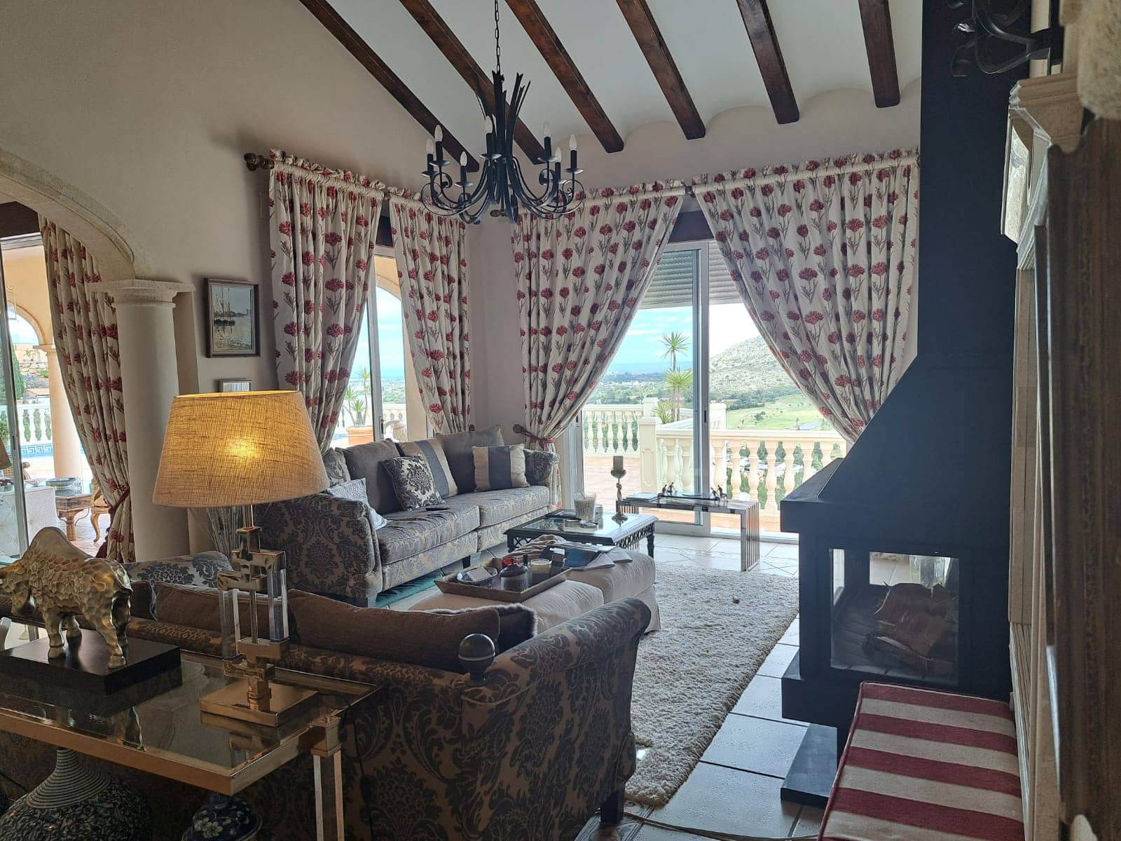 At the heart of the home is a magnificent living space, complete with double-height ceilings, a large wood-burning stove and sliding patio doors that open onto an expansive terrace and pool area with breathtaking views over the 27 hole golf course across the valley to the blue of the Mediterranean and the many colours of Montgó mountain and natural park —perfect for relaxing, outdoor dining and entertaining.