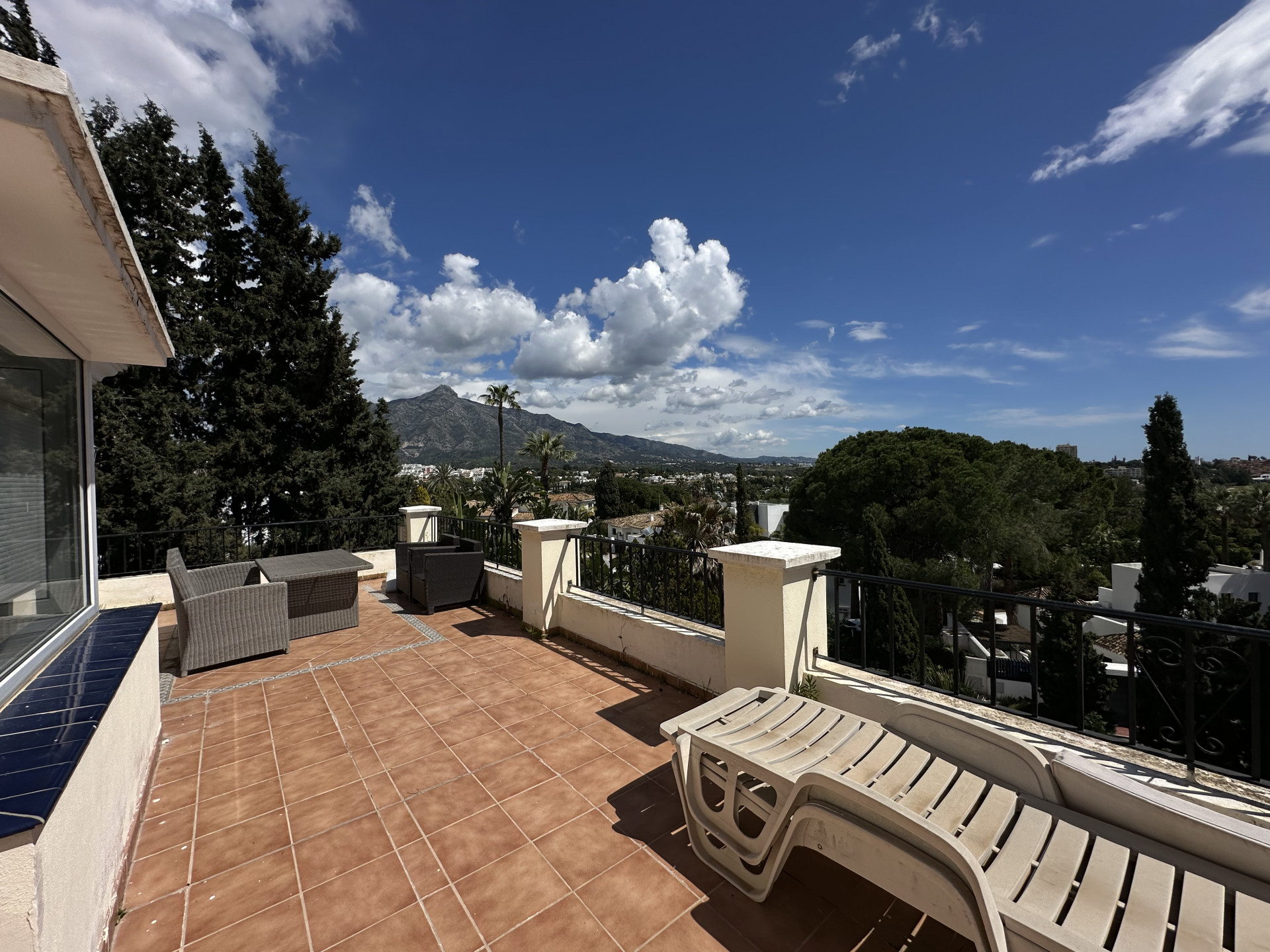 Additional features include a private garage, ample outdoor space, and close proximity to celebrated golf courses such as Las Brisas, Aloha and Los Naranjos. While the villa would benefit from renovation, it presents a rare chance to personalise a substantial property in an exclusive location on the Costa del Sol.
