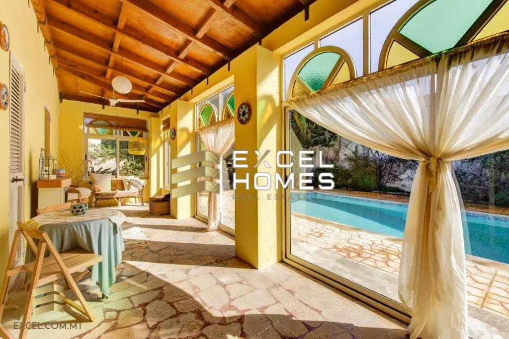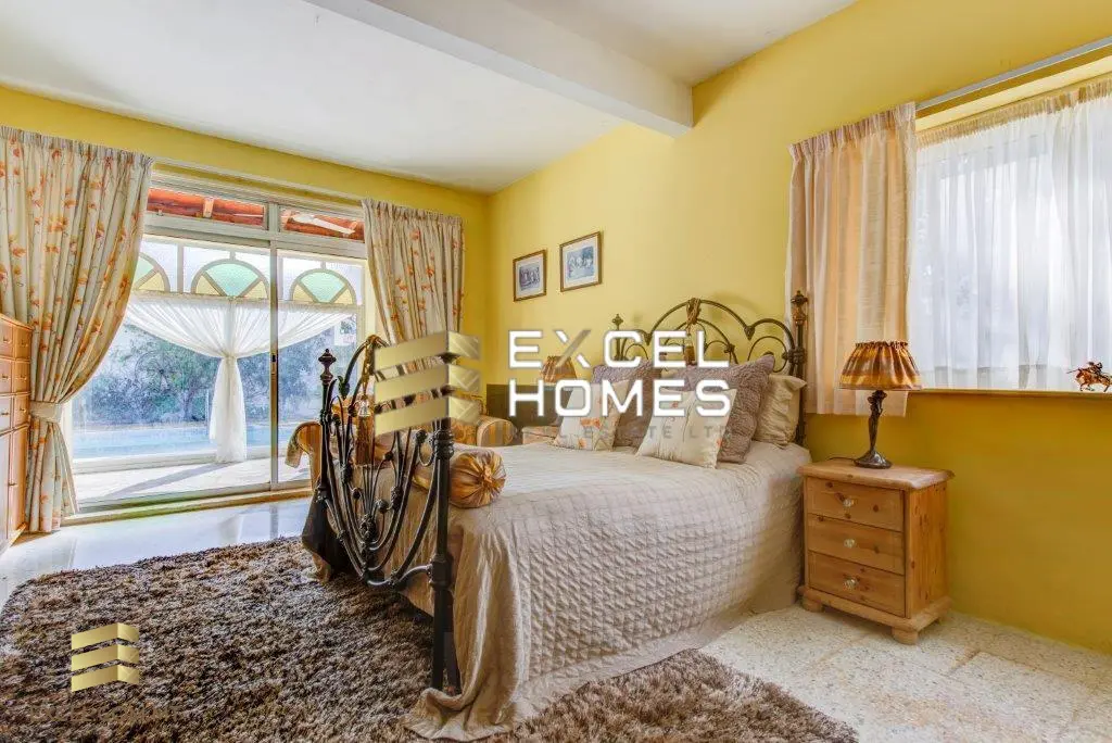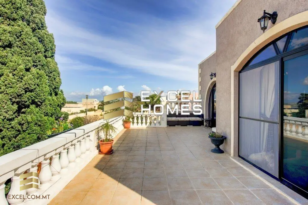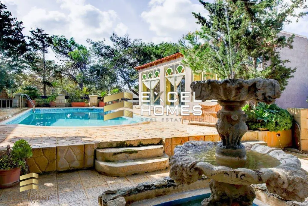 STA MARIJA ESTATE MELLIEHA Beautiful bright and airy fully detached villa built on a plot of approx 1 tumolo on solid rock is being offered for sale in this much sought after area enjoying spectacular sea and country views stretching to Comino and beyond metres Accommodation comprises of a welcoming entrance hall large lounge leading onto a 47mtr front terrace with seaviews dining area fully equipped kitchen breakfast room and a study The master bedroom includes a fabulous en suite bathroom and is annexed to a charming conservatory leading to the large pool deck and BBQ area and landscaped gardens with endemic trees ideal for entertaining There are two further bedrooms a family bathroom pool shower room and washroom Stairs lead to the lower floor which has a further spacious three bedrooms a large games room lounge bathroom and has an independent access out onto the surrounding gardens Includes 4 car drive A must see