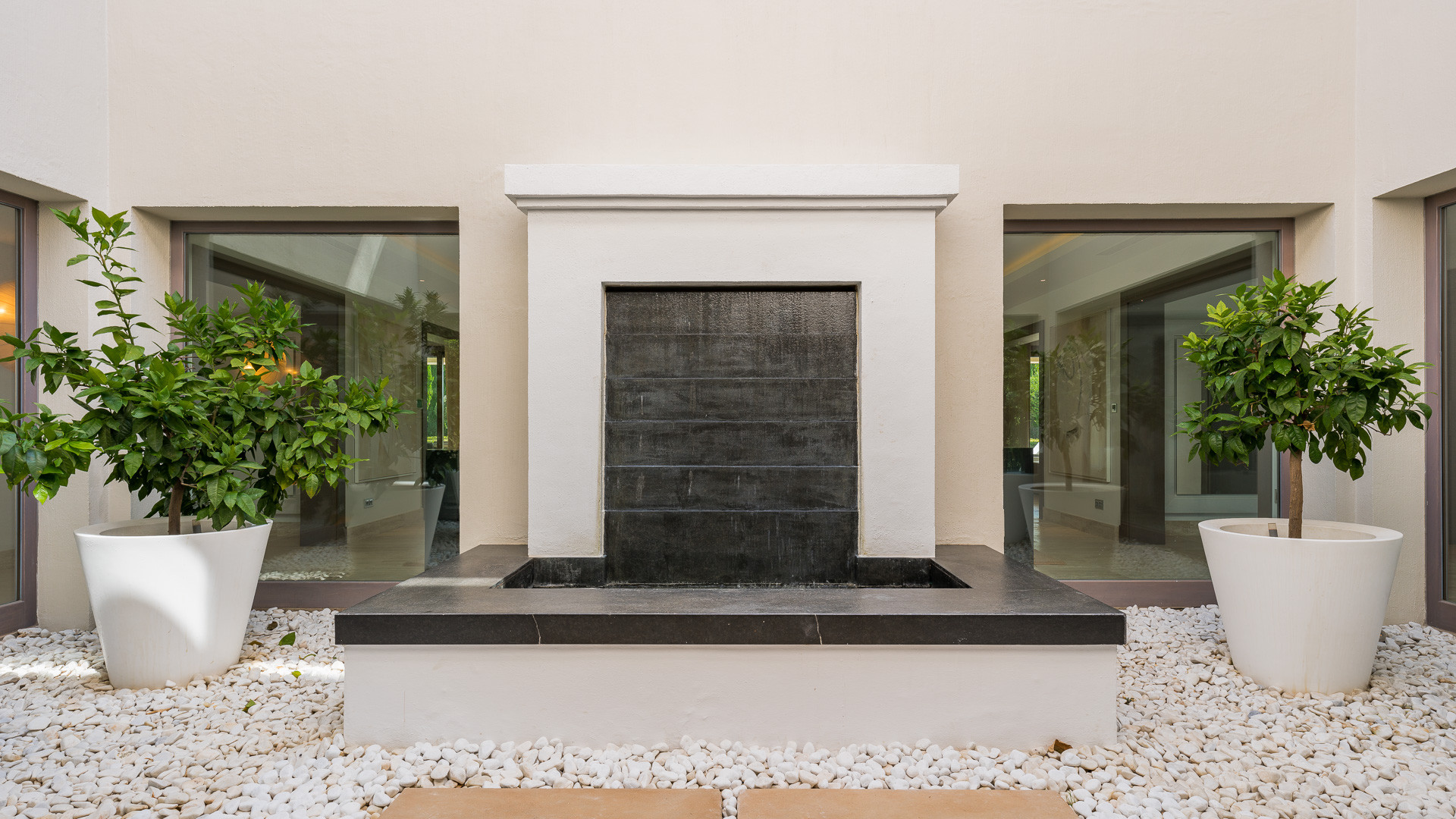 The ground floor exudes an open-plan elegance that showcases the villa’s full splendour. Two spacious en-suite double bedrooms provide the epitome of comfort and relaxation. Here, you’ll find both indoor and outdoor dining areas, a kitchen equipped with top-of-the-line Gaggenau appliances, designed to cater to your every need, whether for relaxation or entertaining. The natural flow of the ground floor, enhanced by an inviting entrance atrium and a soothing waterfall, creates a warm and inviting ambiance. This level seamlessly connects to a covered porch and meticulously landscaped gardens and lawns.