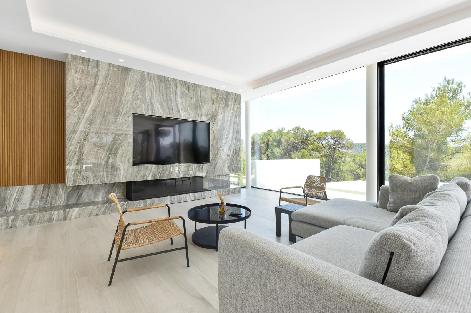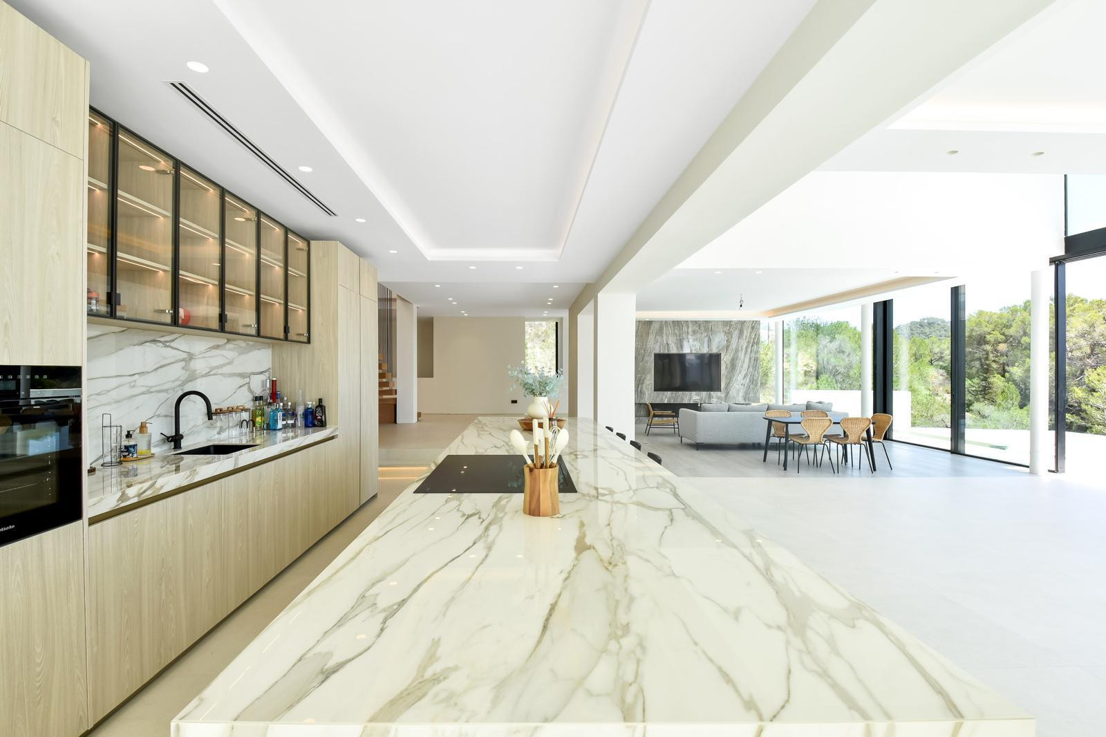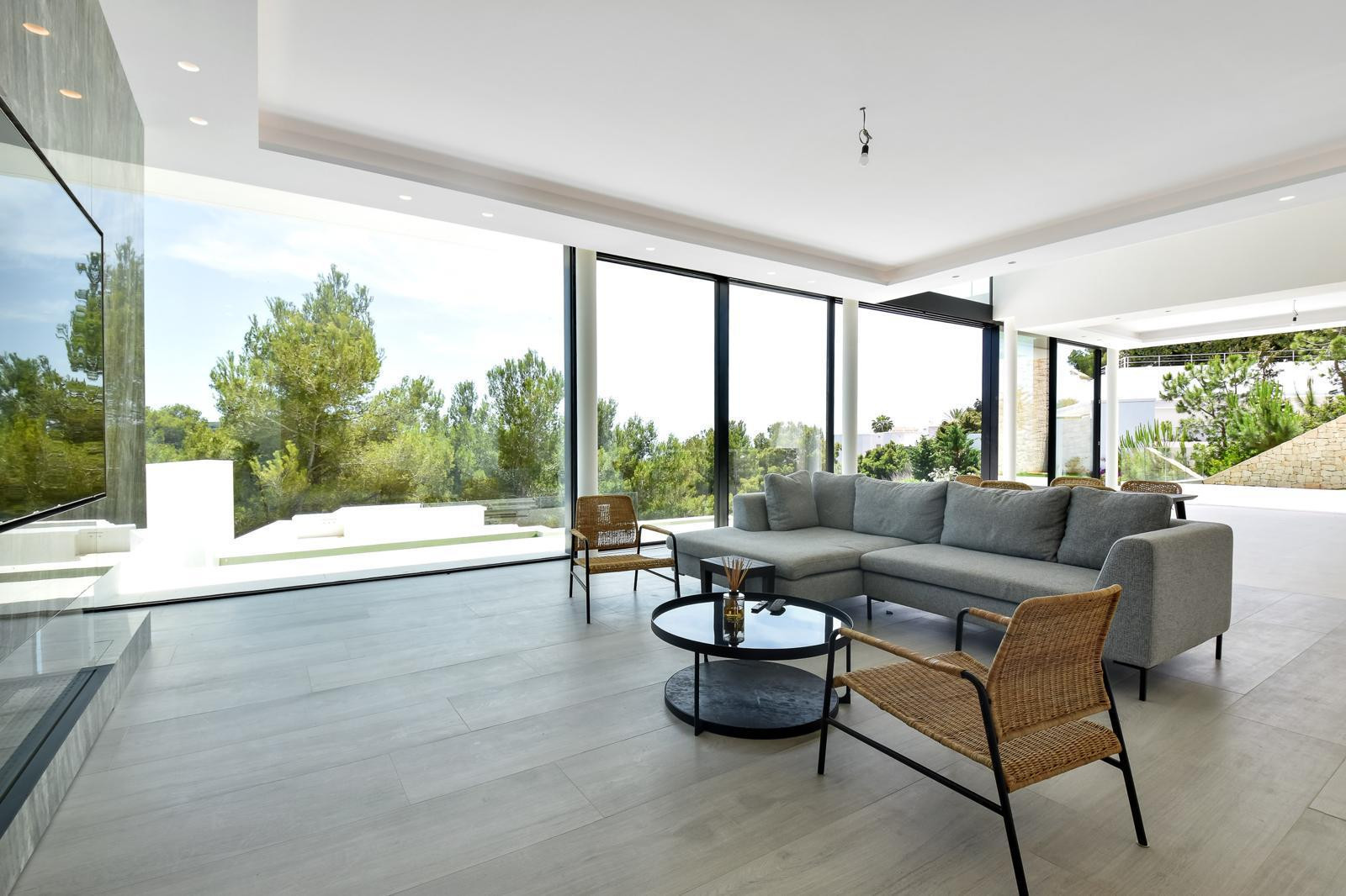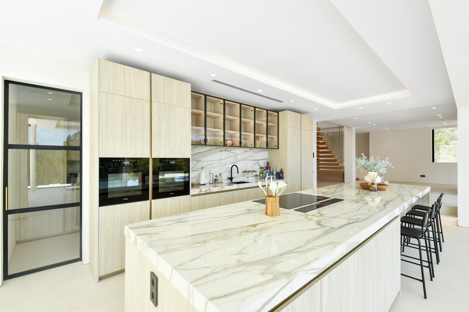 This architectural masterpiece perfectly combines contemporary design with Mediterranean touches, offering a light-filled home thanks to its floor-to-ceiling windows. Additionally, with its south-facing orientation, the property enjoys sunlight all day, allowing for perfect natural illumination throughout its spaces.