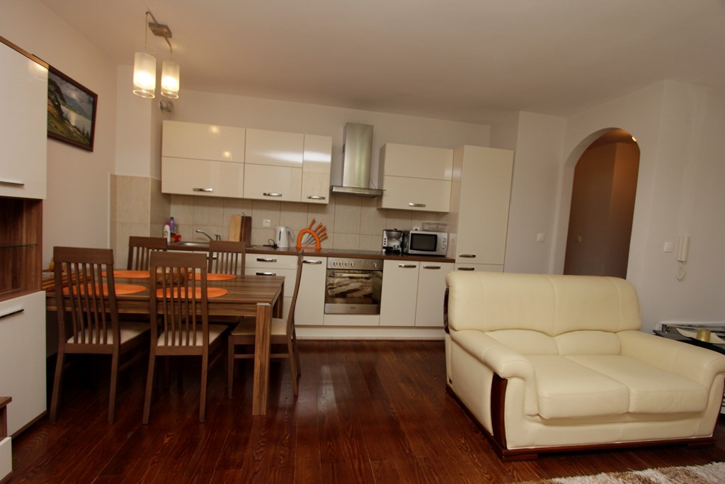 NUM 3003 Apartment for sale in Przno, with a total area of 63 m2. The apartment is located on the first floor in a 5-storey building. The building is within distance of 50 m from the center of the town, 100 m from the nearest supermarket and bus station. It is also 5 minutes walking distanced from Hotel Maestral. The apartment is fully furnished. The apartment has: living room with kitchen, hall, one bedroom, one bathroom and a terrace. The nearest beach has gravel type sand.