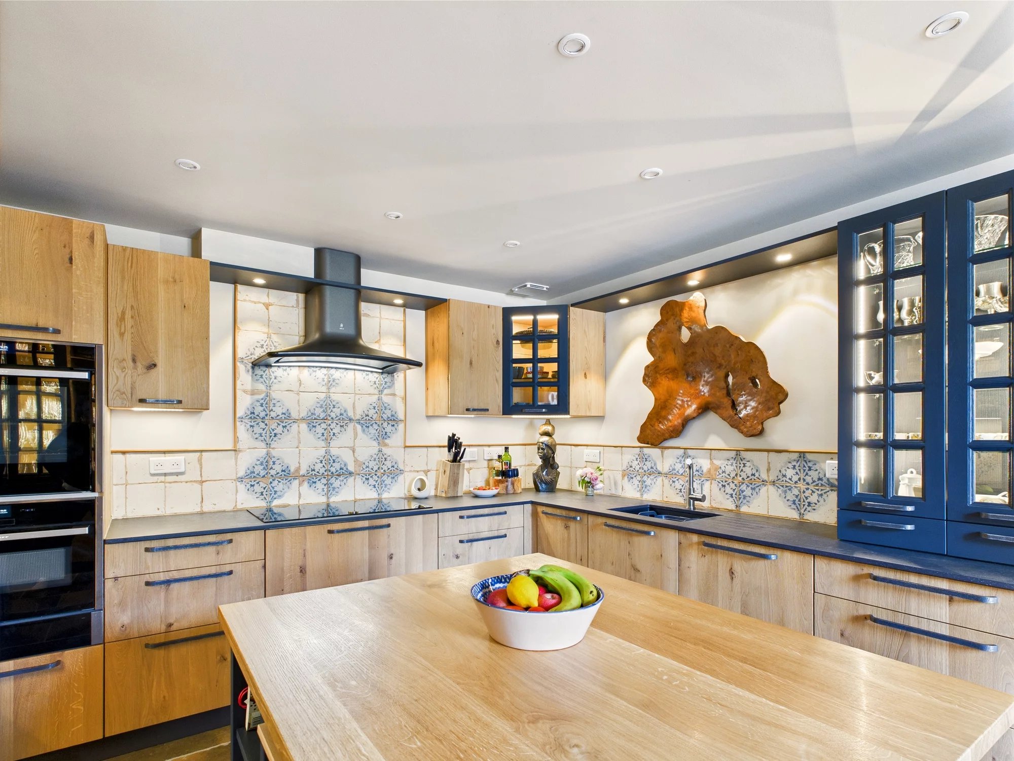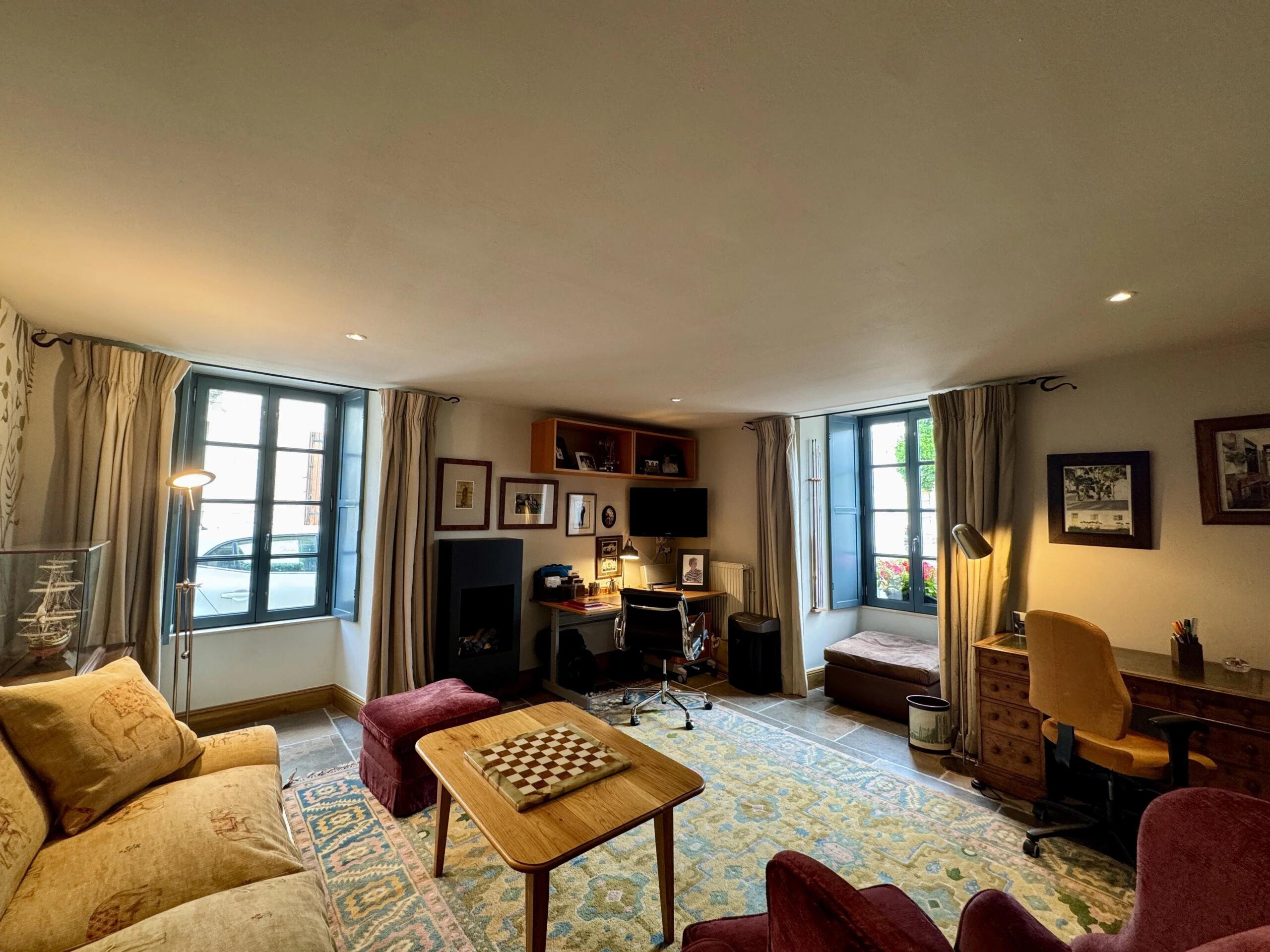 At the rear, a beautifully landscaped courtyard garden offers an unexpected oasis of calm in the town centre, complete with a central fountain, a 40m² covered terrace, an outdoor kitchen, and a separate workshop. The property also benefits from a newly built garage with electric car charging, level access, and electrically operated doors.