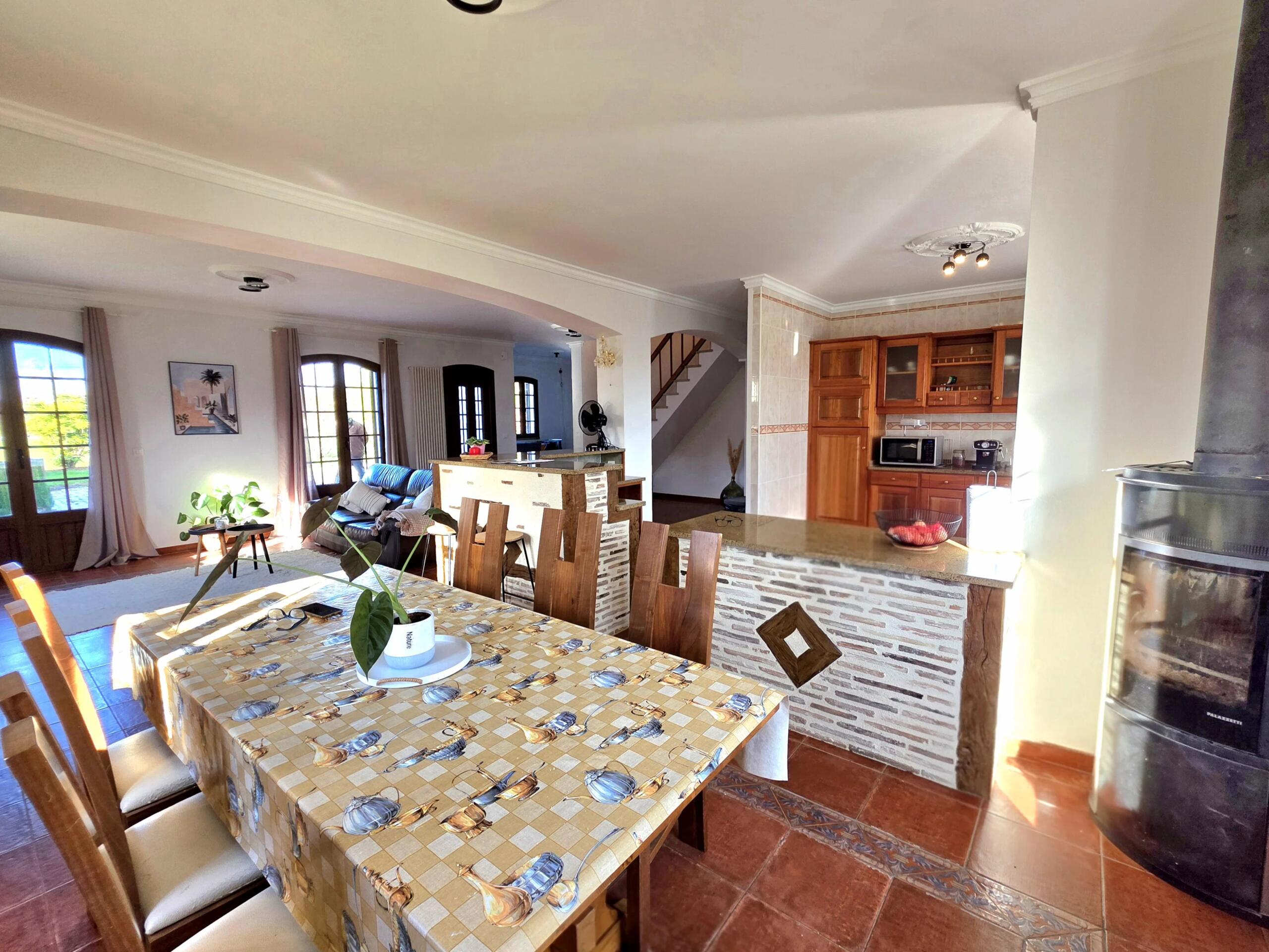 The ground floor features a spacious open-plan living room with the kitchen to one side and windows facing in three directions, creating a bright and airy feel. To the rear, there is an adjoining office area, and a hallway decorated with attractive Portuguese wall tiles leads to two ground-floor bedrooms (11.3 m² and 12.7 m²), the larger of which includes built-in wardrobes. This level also offers a family bathroom (6.6 m²), a separate toilet, and a pantry/laundry room (6.6 m²) with an internal door connecting to the adjoining 27 m² garage. The garage is equipped with an electric up-and-over door, and it also houses the heating systems.