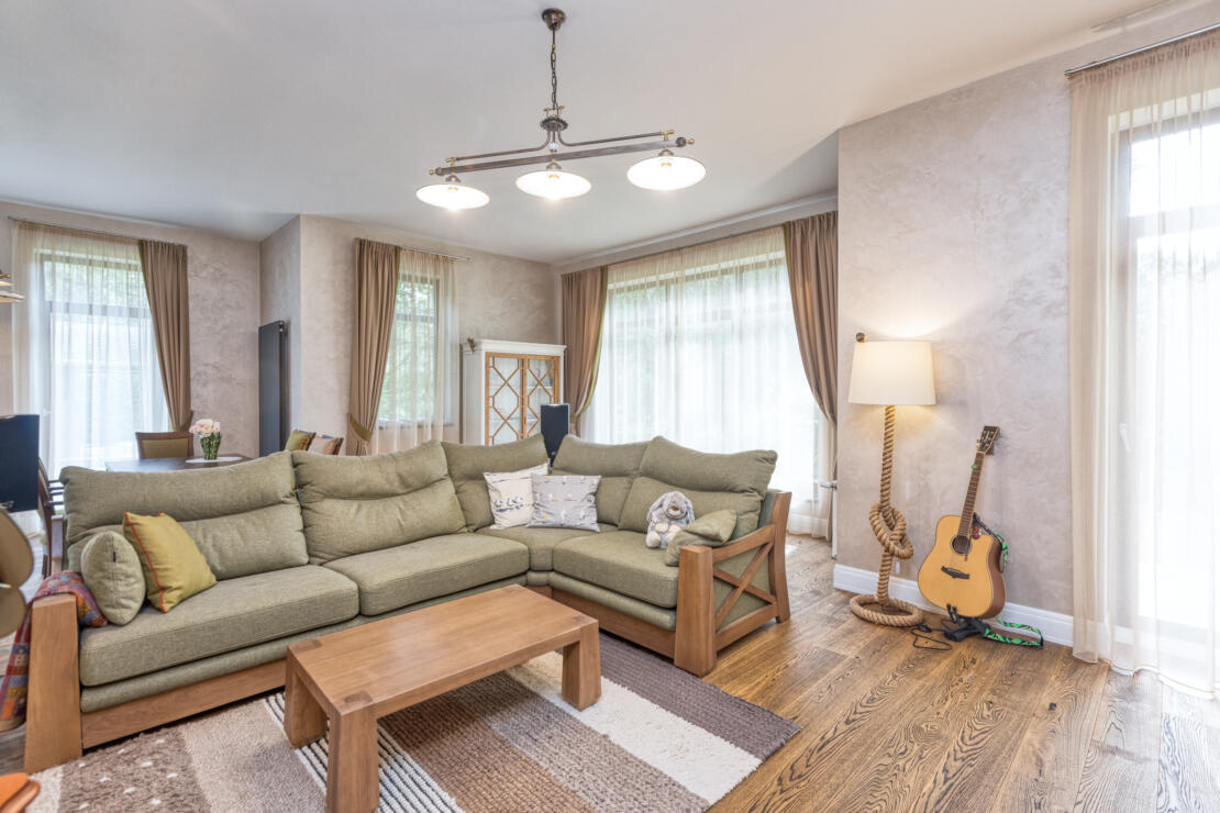 The ground floor features a spacious hallway, a utility room, a guest bathroom, a study, a large, cozy living room with a large, beautiful fireplace, connected to the kitchen, and two spacious terraces. On the second floor there is a master bedroom with its own bathroom, where there is a bathtub and a shower, two bedrooms with a dressing room and another bathroom, two balconies from which you can greet the sun. The house is equipped with all modern amenities, including a stove, water filters, natural gas heating, a fireplace, and a lawn with a built-in automatic irrigation system and mole netting.