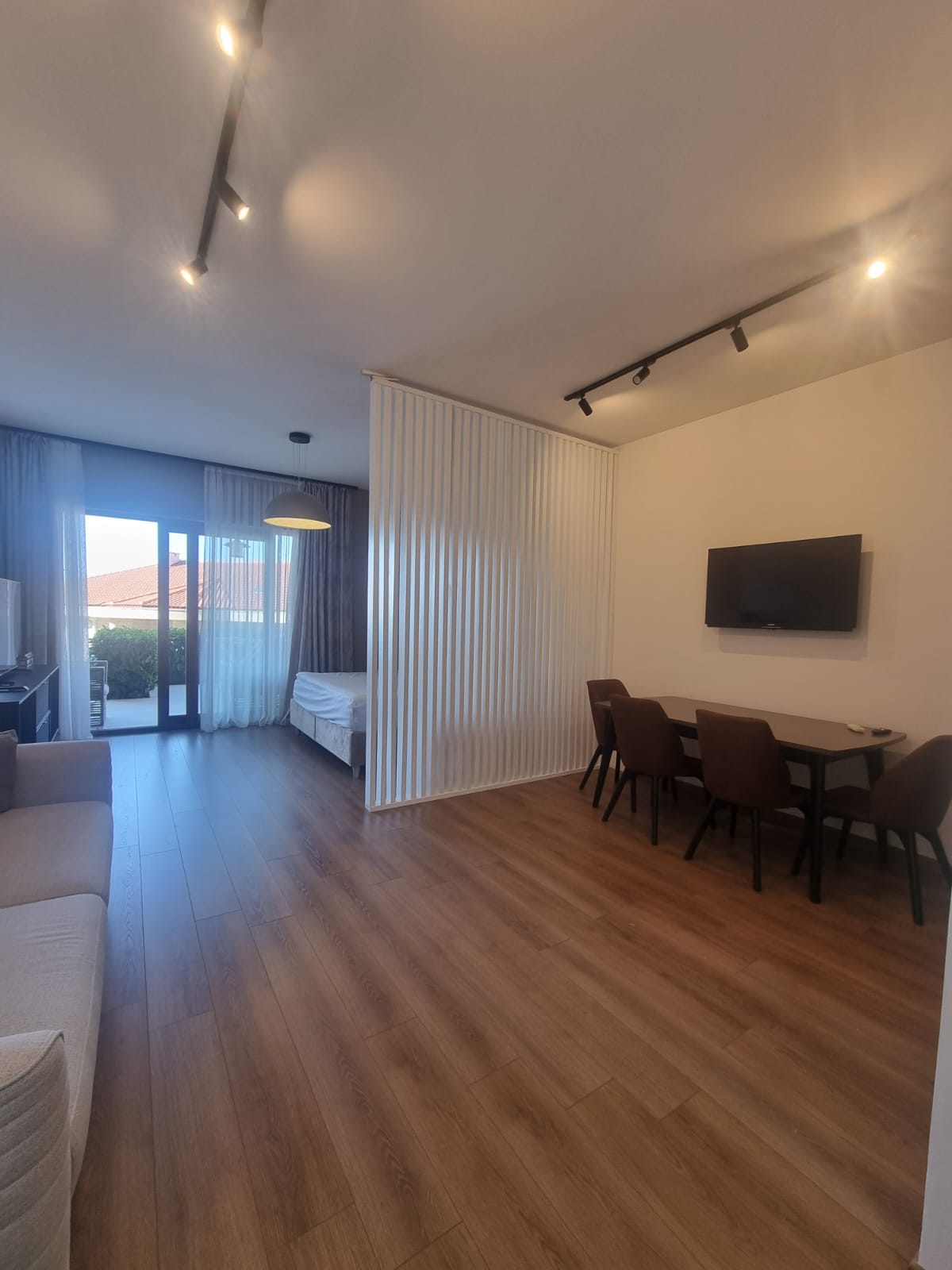 Layout of the apartment: living room with dining room combined with open kitchen, bathroom and spacious balcony. The apartment is furnished and equipped and is selling with all the furniture. There is direct access to the pool from the terrace.