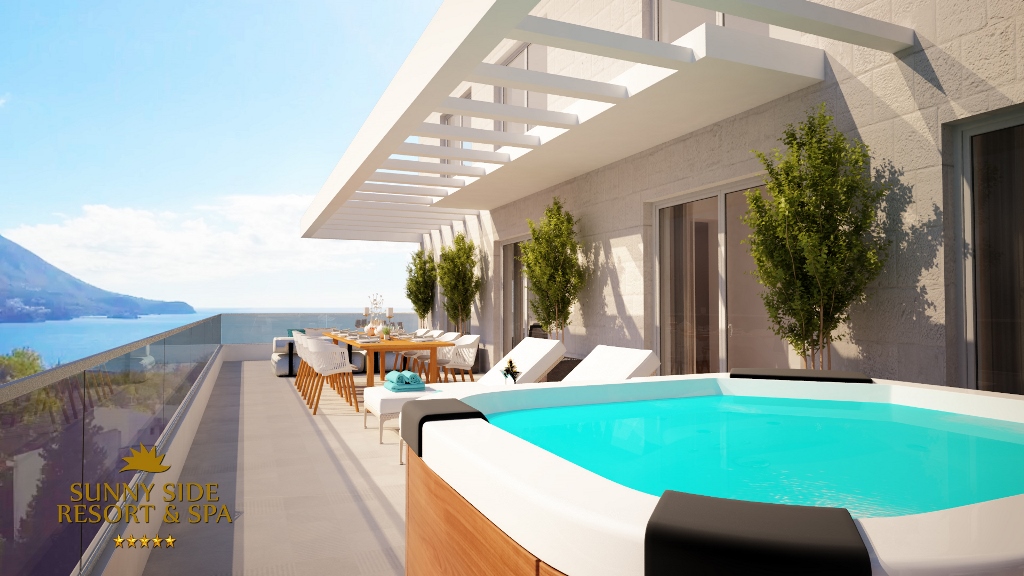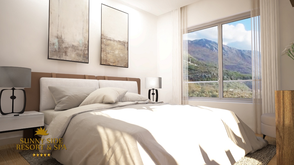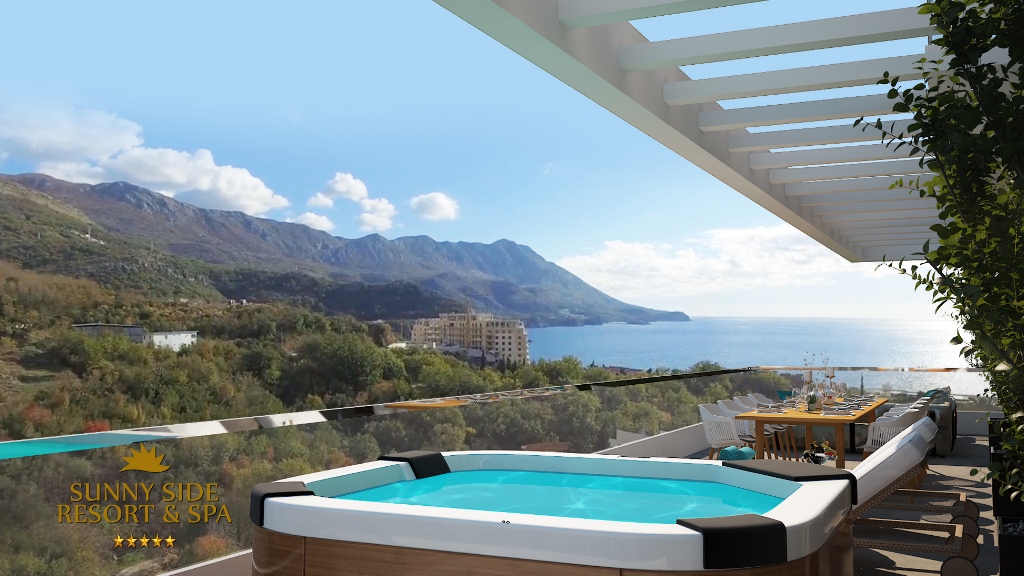NUM 5450 Sunny Side Spa & Conference is a unique complex with an excellent location and impressive infrastructure. Walking 7-8 minutes towards the sea, without steep slopes, along a pleasant road in the forest while enjoying the flow of a stream, you will get to Becici beach, one of the best beaches in Montenegro, a beach with a blue flag, one of the cleanest beaches in Europe!