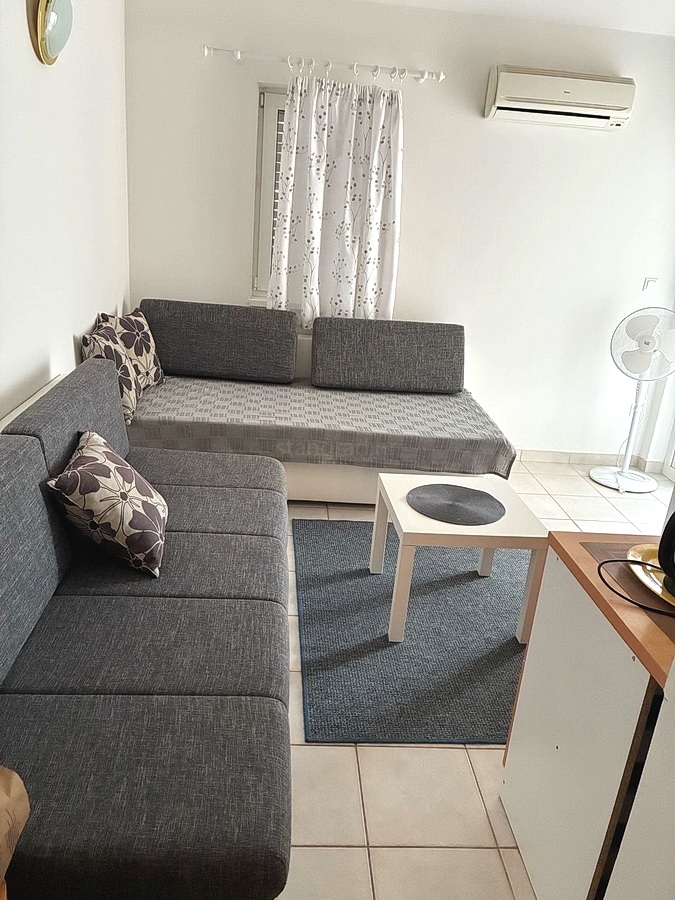 The apartment is situated in the upper attic of a residential building on the third floor, with a total area of 22 m². It consists of a living room that doubles as a sleeping area, a kitchen, a bathroom, and a loggia with a sea view. The interior is well-maintained and equipped with quality appliances and functional furniture. Parking is available on public spaces near the building.