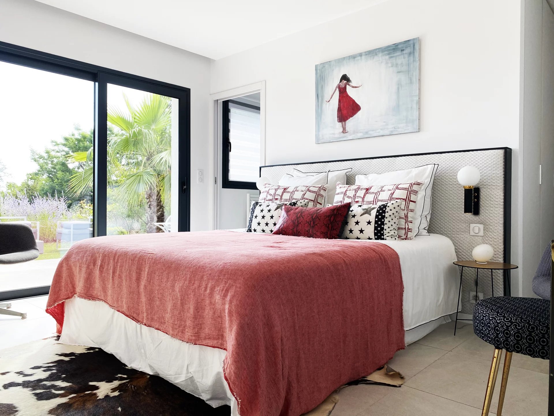 Designed by a renowned architect, the contemporary villa unfolds approximately 200 sq.m across two levels, revealing a spectacular living space entirely open to the outdoors. Bathed in natural light, it features an elegant lounge, a sophisticated dining area, and a designer kitchen with premium finishes.