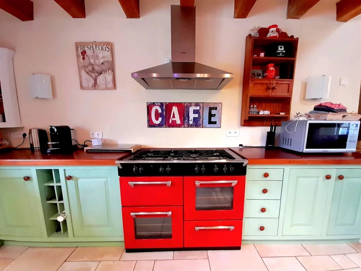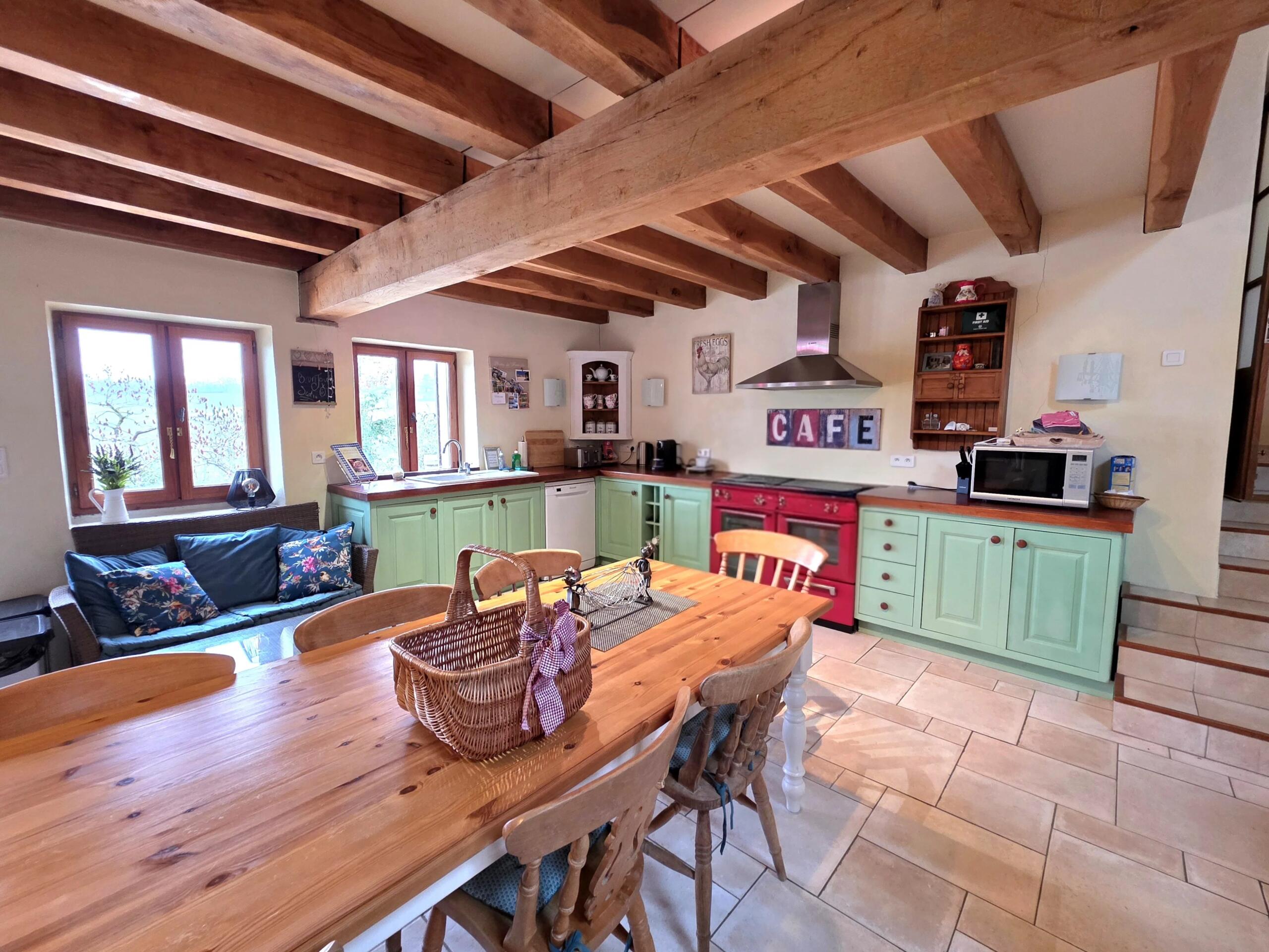 The adjoining farmhouse exudes warmth and character, featuring a cosy living room with wood-burning stove, a kitchen and dining area opening onto a charming covered terrace, a ground-floor en suite double bedroom, and two additional first-floor bedrooms served by a stylish family bathroom.