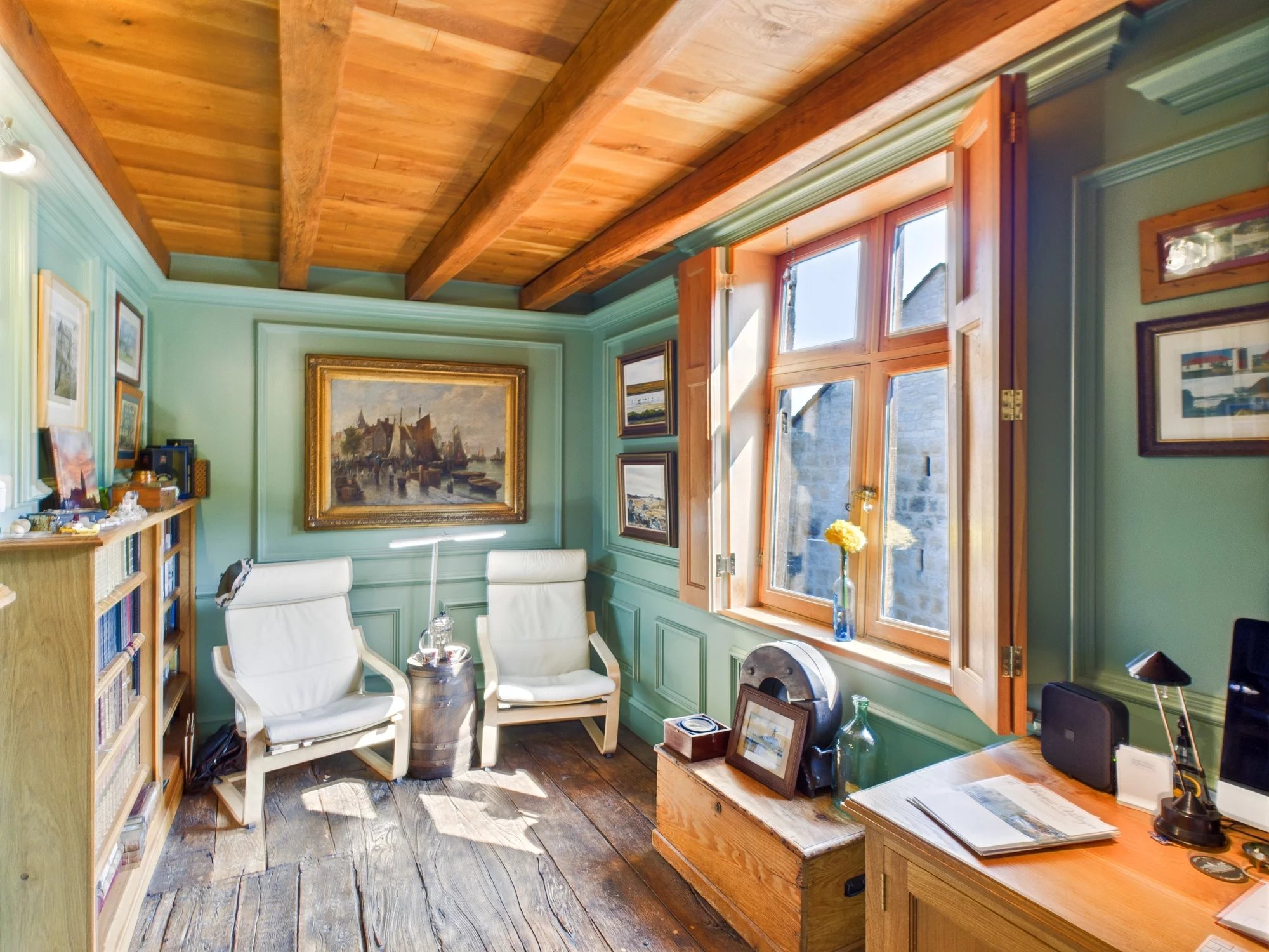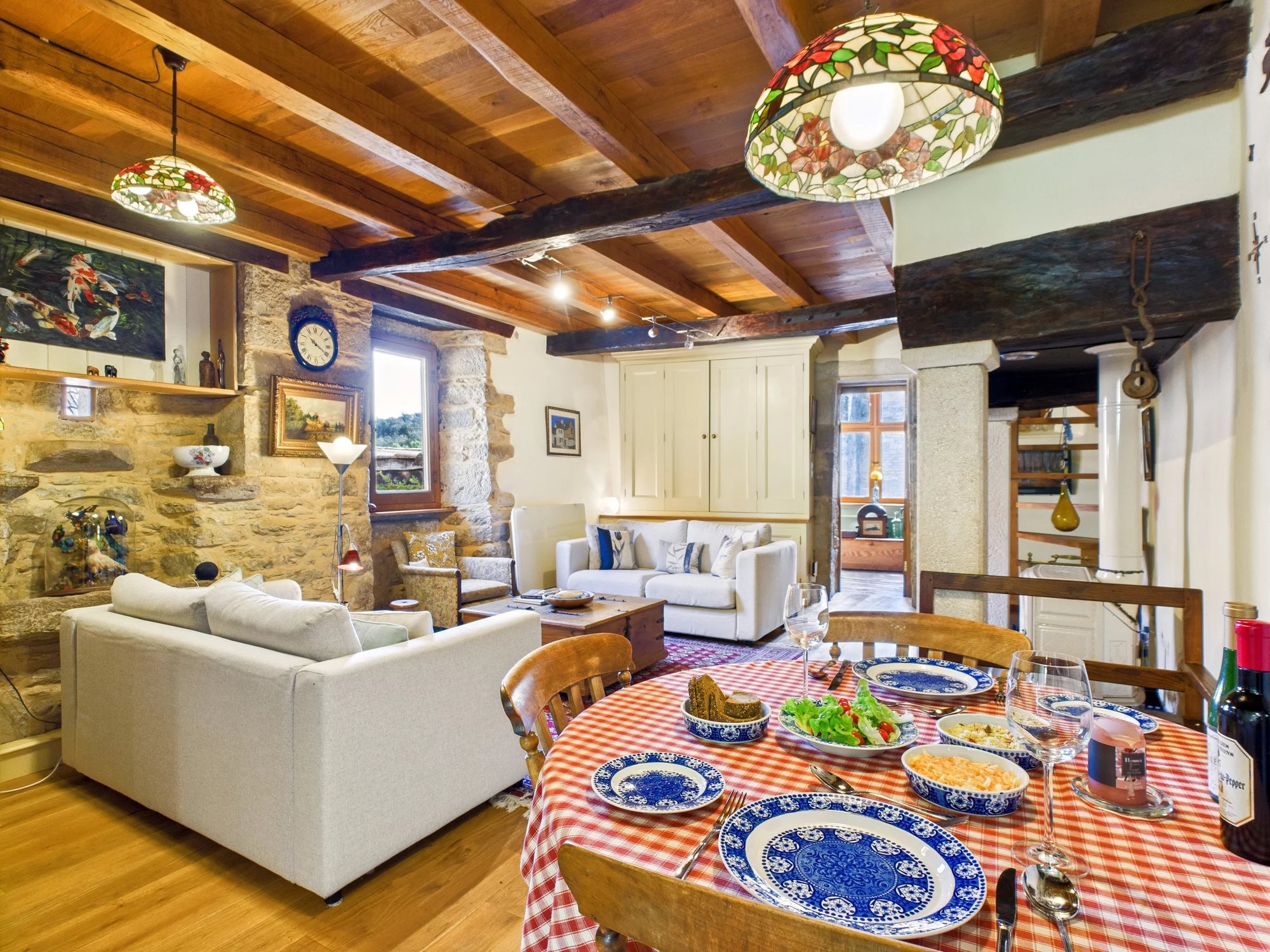 The main house has been immaculately restored over three floors, blending historic charm with quality modern finishes. It features 3 bedrooms, 2 bathrooms, exposed stone walls, oak beams and floors, and bespoke joinery throughout. Two handcrafted spiral staircases add a quirky touch while maximising space. The living room is generous in size, while the bedrooms are compact but thoughtfully use every inch of space. There are beautifully hand built storage solutions throughout the house. A private 20m² terrace offers a quiet spot with views of the village church and chateau.